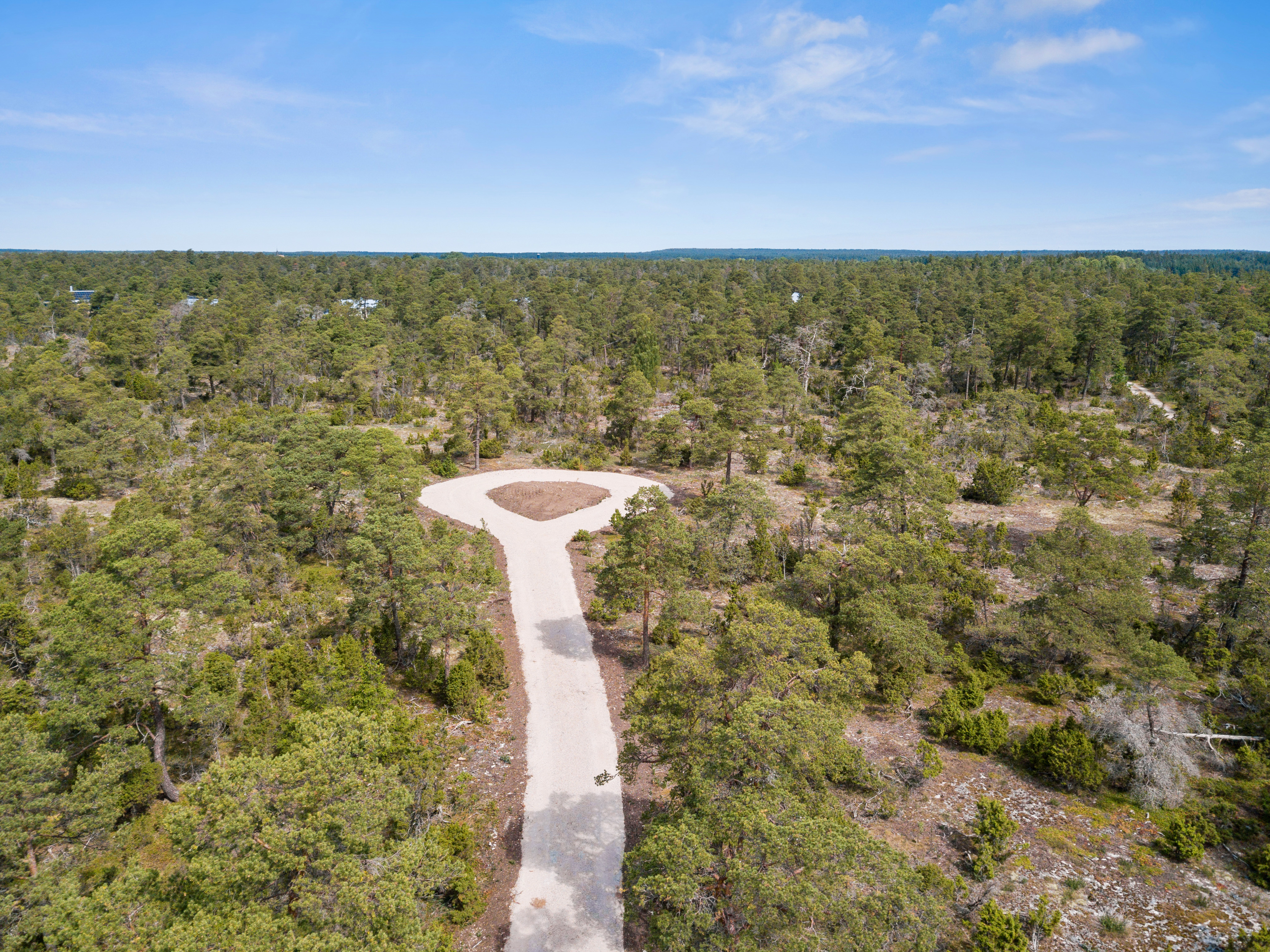 Fin och solig natur/skogstomt med enbuskar och tallar.