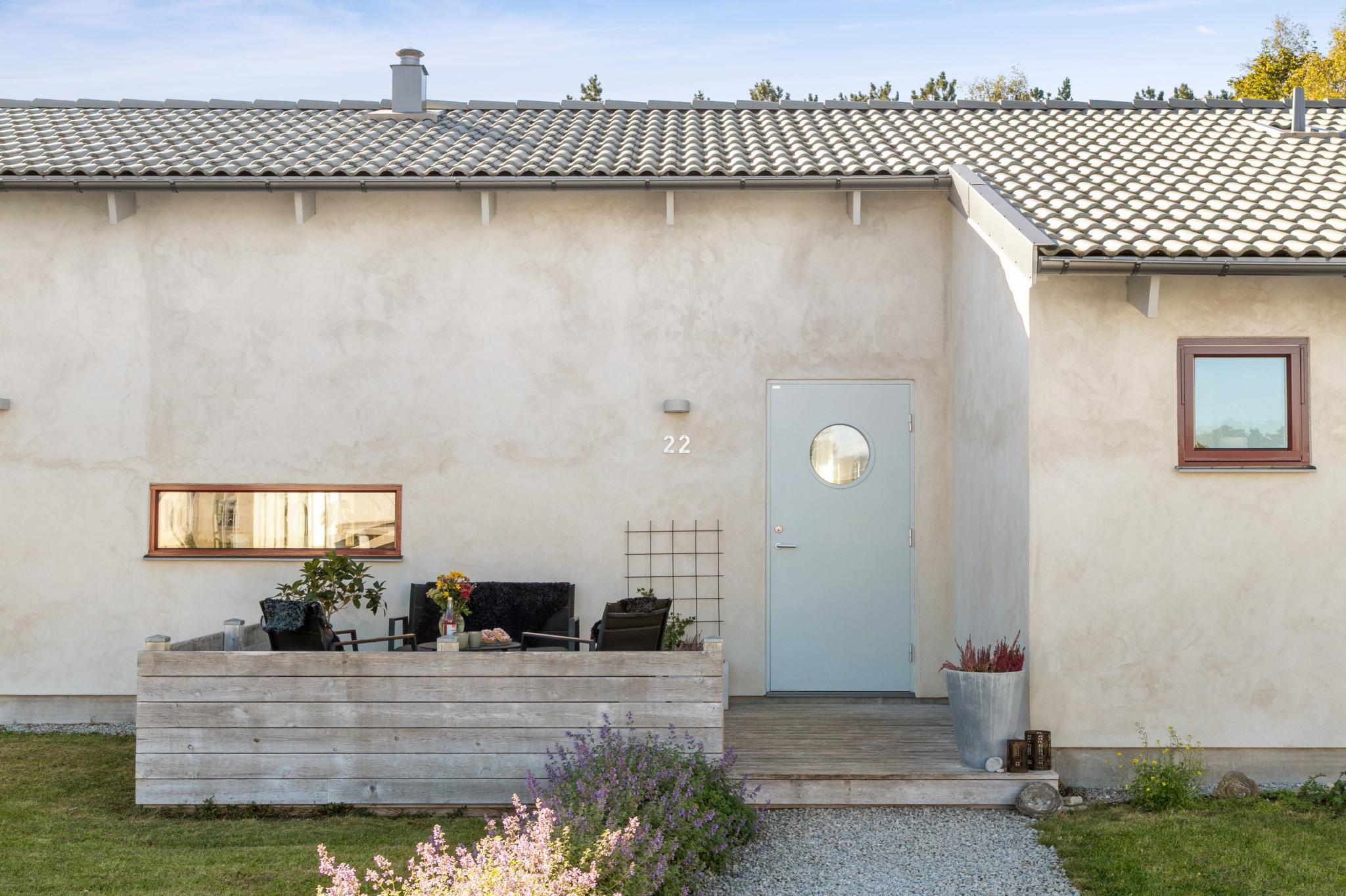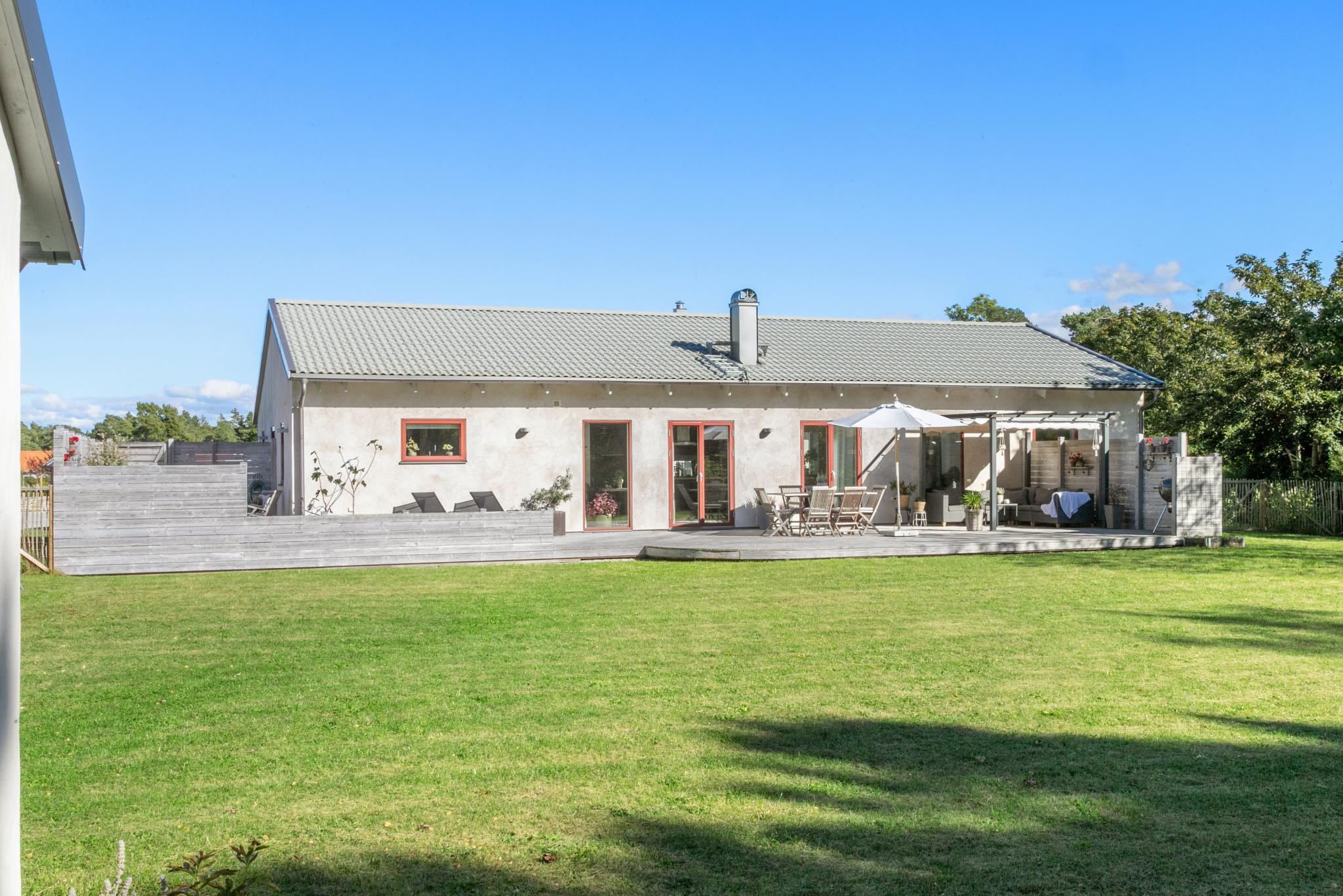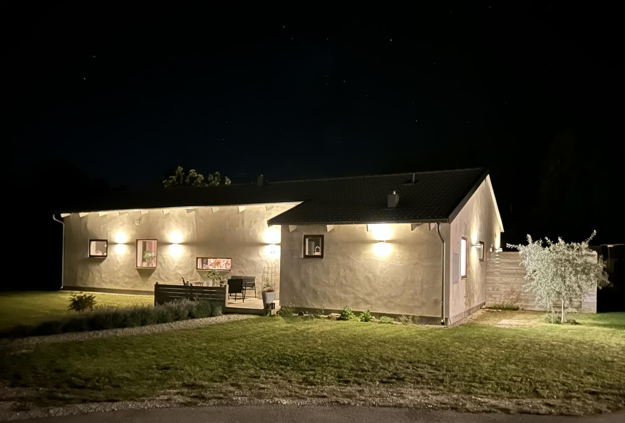 Välkommen till ett mycket trevligt hus med många fördelar. Huset har en tilltalande öppen planlösning med kök och allrum som bjuder in till både umgänge och avkoppling. Rummet har ryggåstak med 3,60 m till nock vilket ger en skön och luftig känsla. Alla rum har vattenburen golvvärme, smakfulla färgval och fönsterbänkar av gotländsk kalksten. Putsade väggar och klinkergolv i alla rum utom sovrummen som har ekgolv. Belysning i form av dimbara spotlights och dessutom minispotlights i alla fönster gör det extra trivsamt. Modernt med ljusstyrning från Plejd via app i mobilen och förberett för högtalare i taket i allrummet.