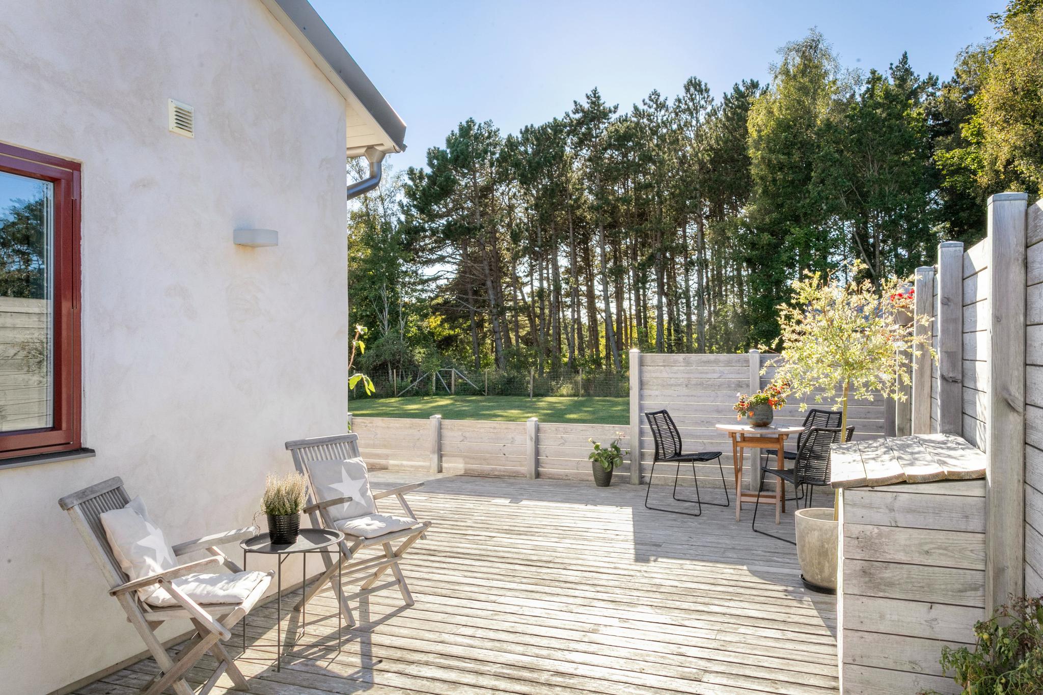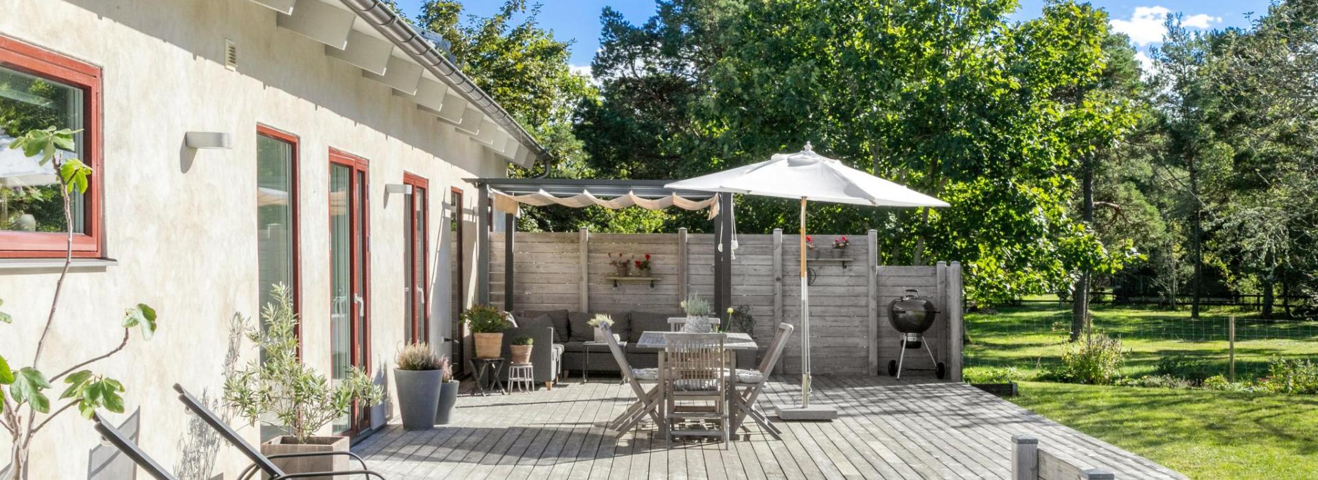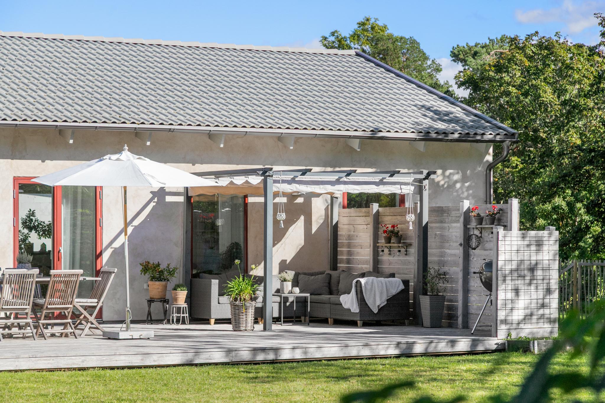 På husets soliga baksida finns en stor altan i trä (Organowood) i vinkel runt huset. Uteplatsen är underbart stor och fint inramad. Här finns plats för både solstolar, loungemöbler och trädgårdsmöbler. Perfekt för lata sommardagar eller sköna grillkvällar. På huset framsida finns en skyddad altan i anslutning till entrén. Här njuter du av frukost i morgonsolen eller om solens strålar på baksidan blir för varma.