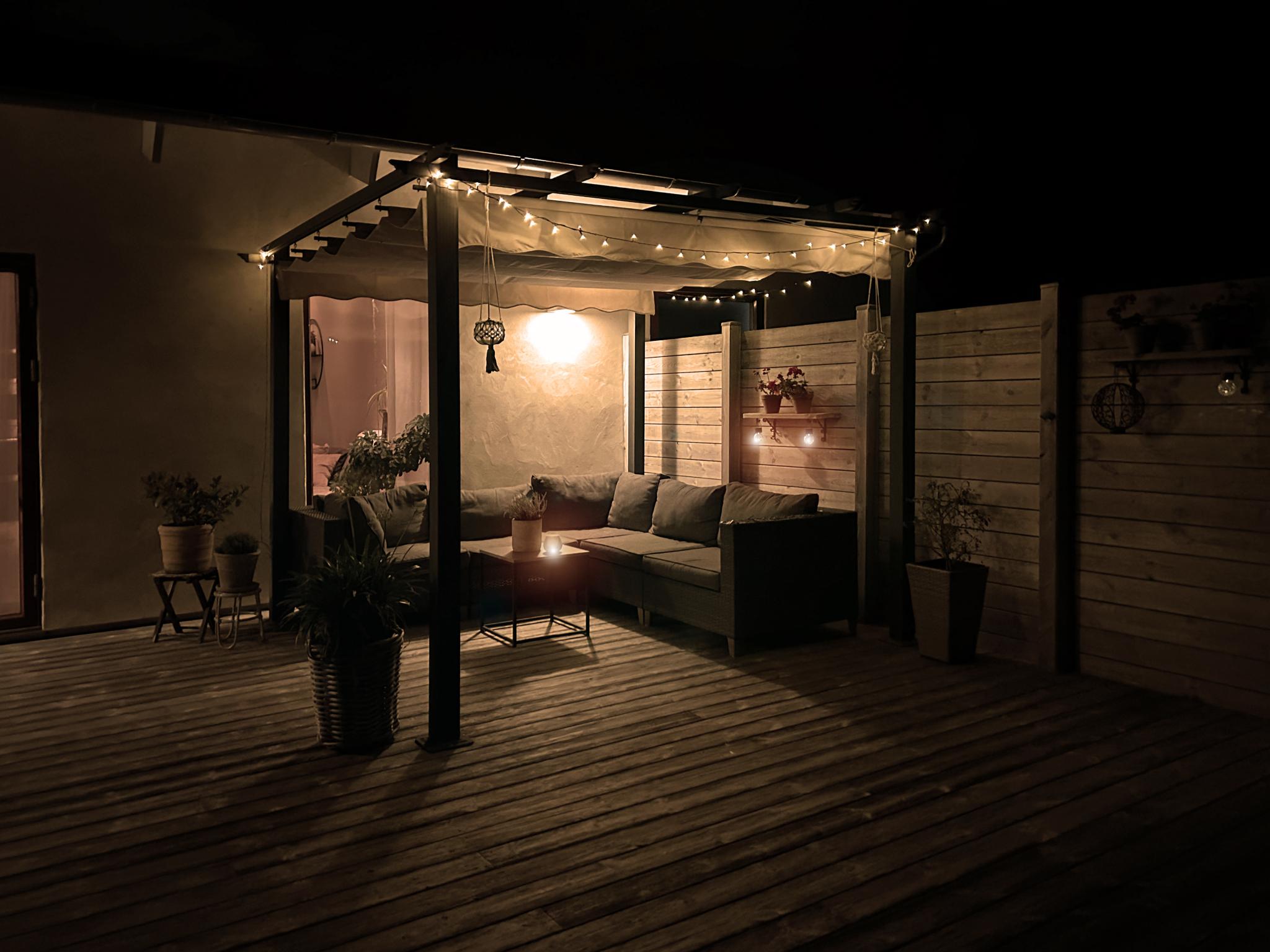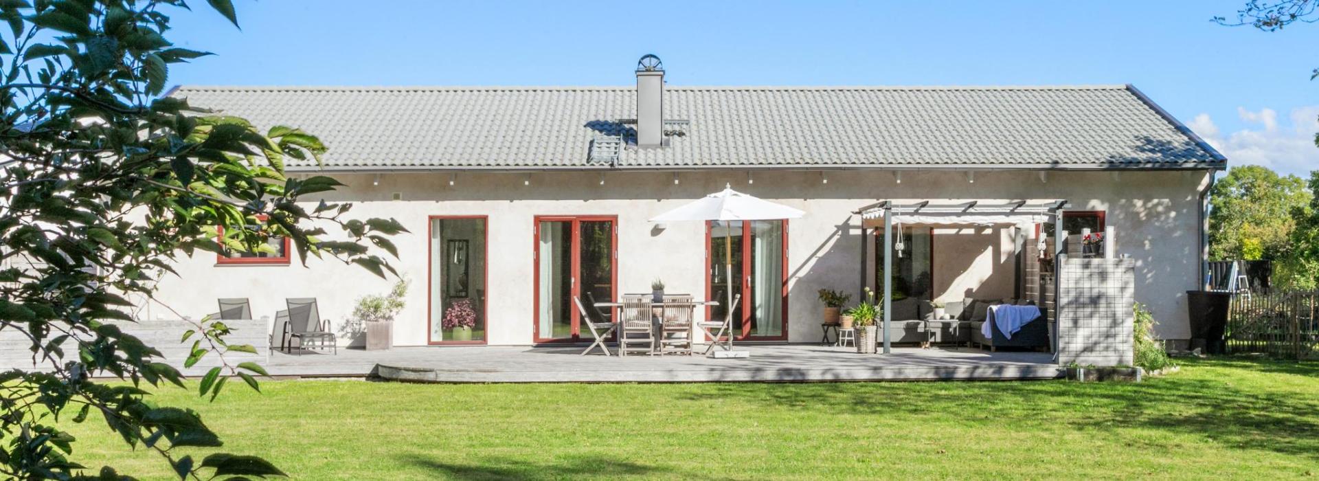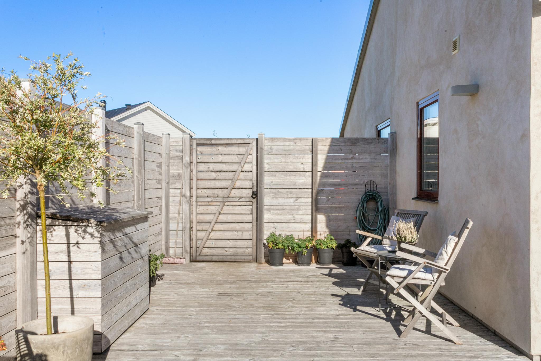 På husets soliga baksida finns en stor altan i trä (Organowood) i vinkel runt huset. Uteplatsen är underbart stor och fint inramad. Här finns plats för både solstolar, loungemöbler och trädgårdsmöbler. Perfekt för lata sommardagar eller sköna grillkvällar. På huset framsida finns en skyddad altan i anslutning till entrén. Här njuter du av frukost i morgonsolen eller om solens strålar på baksidan blir för varma.