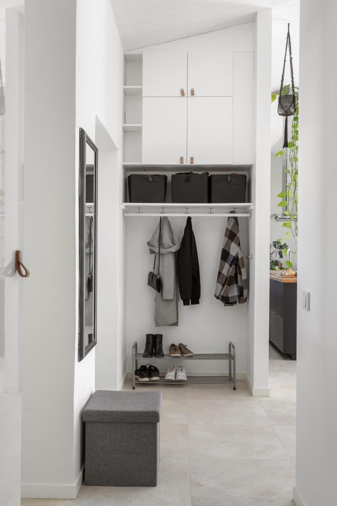 Entré/hall med plats för ytterkläder och skor. Förvaring i skåp och två garderober.