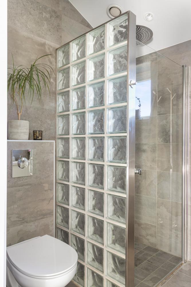 I anslutning till hallen finns ytterligare ett fint badrum i samma stil som det andra. Även här är det beigegrå klinker på både golv och väggar, dusch med glasdörr och vägg av glasbetong, golvvärme, vädringsfönster och dimbara spotlights.