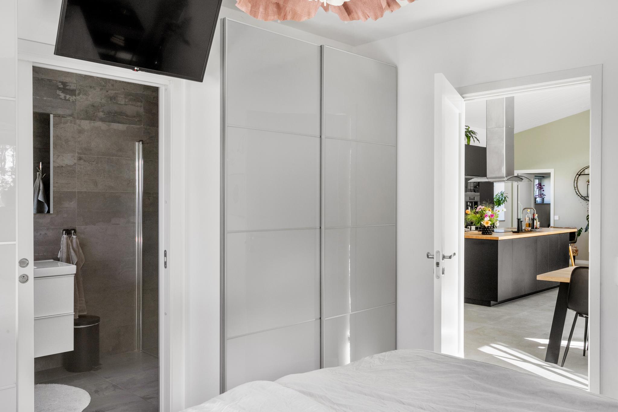 Stort och fint sovrum med väggfast TV och bra förvaring i garderober med skjutdörrar. Rummet har fönster åt två håll och direktaccess till badrum.
