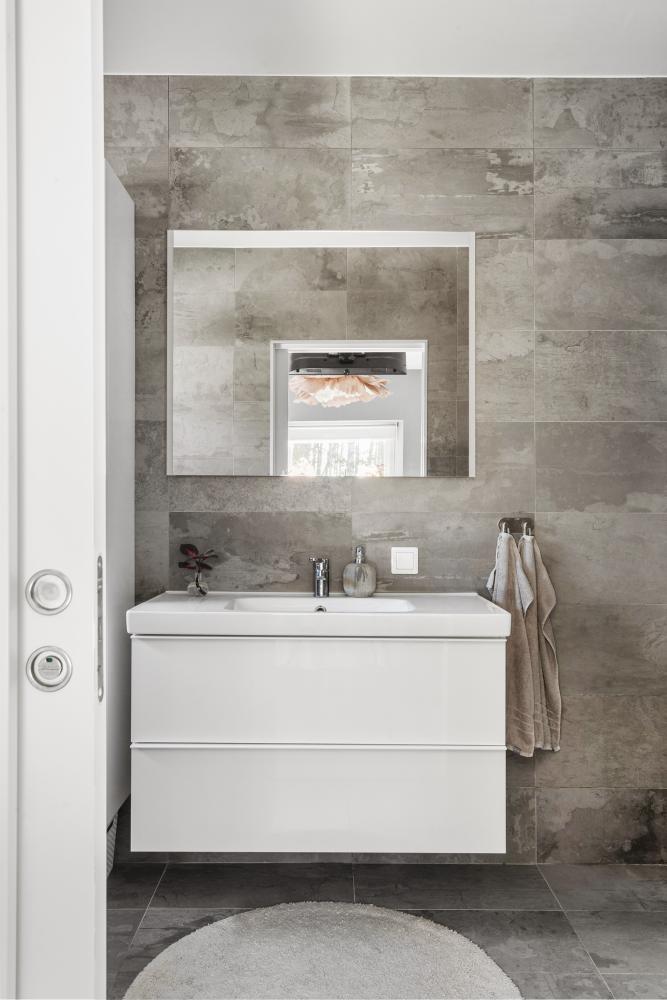 Utrustning: badkar, skåp, tvättställ i kommod, integrerad spegel, dusch (både tak- och handdusch), vägghängd wc och handdukstorkar.