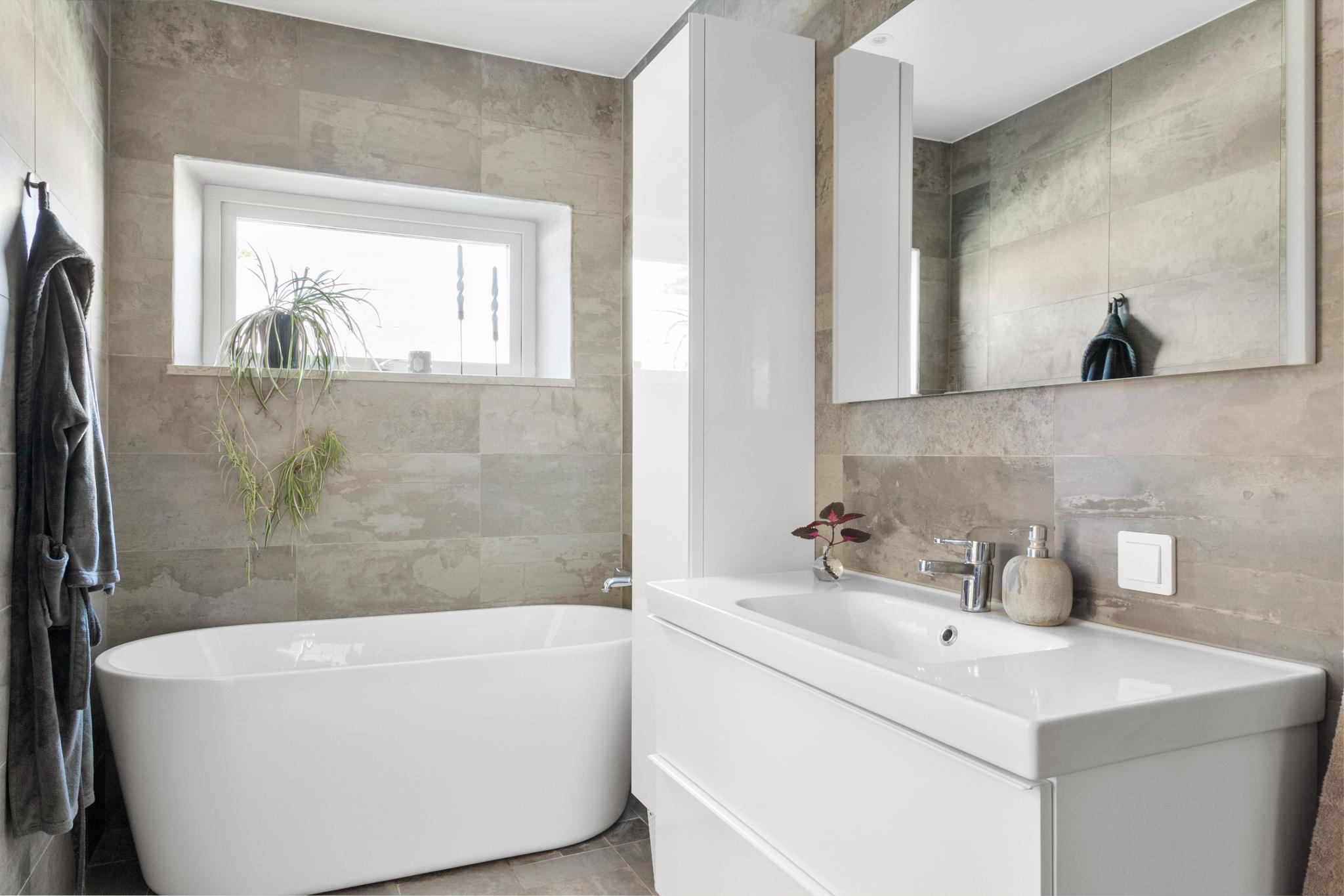 Stilrent badrum med klinker på både golv och väggar i smakfull beigegrå nyans. Rummet är stort och har både badkar och rymlig dusch med glasdörr och vägg av glasbetong. Golvvärme, vädringsfönster och dimbara spotlights gör det extra trevligt.