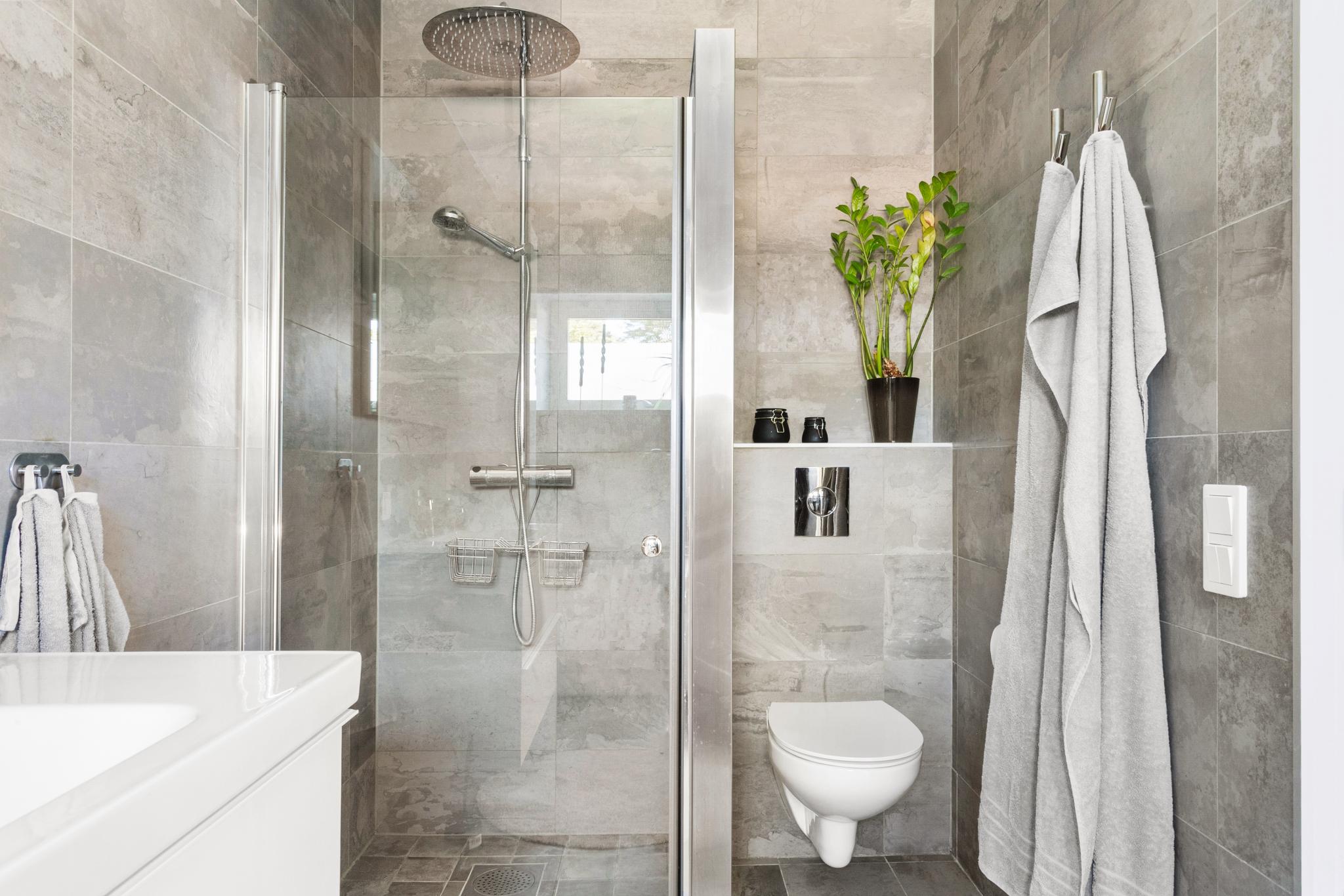 Utrustning: vägghängd wc, dusch (både tak- och handdusch), handdukstorkar, tvättställ i kommod, integrerad spegel och skåp.