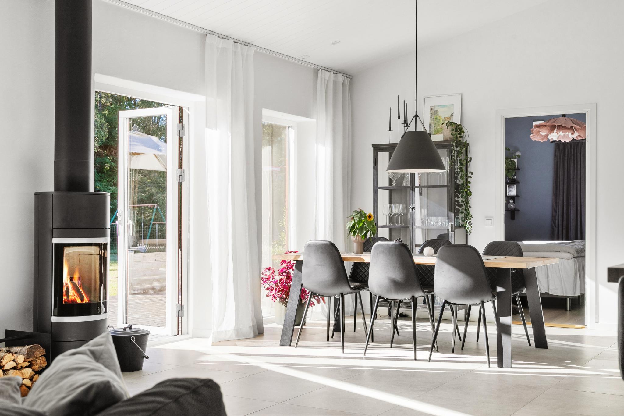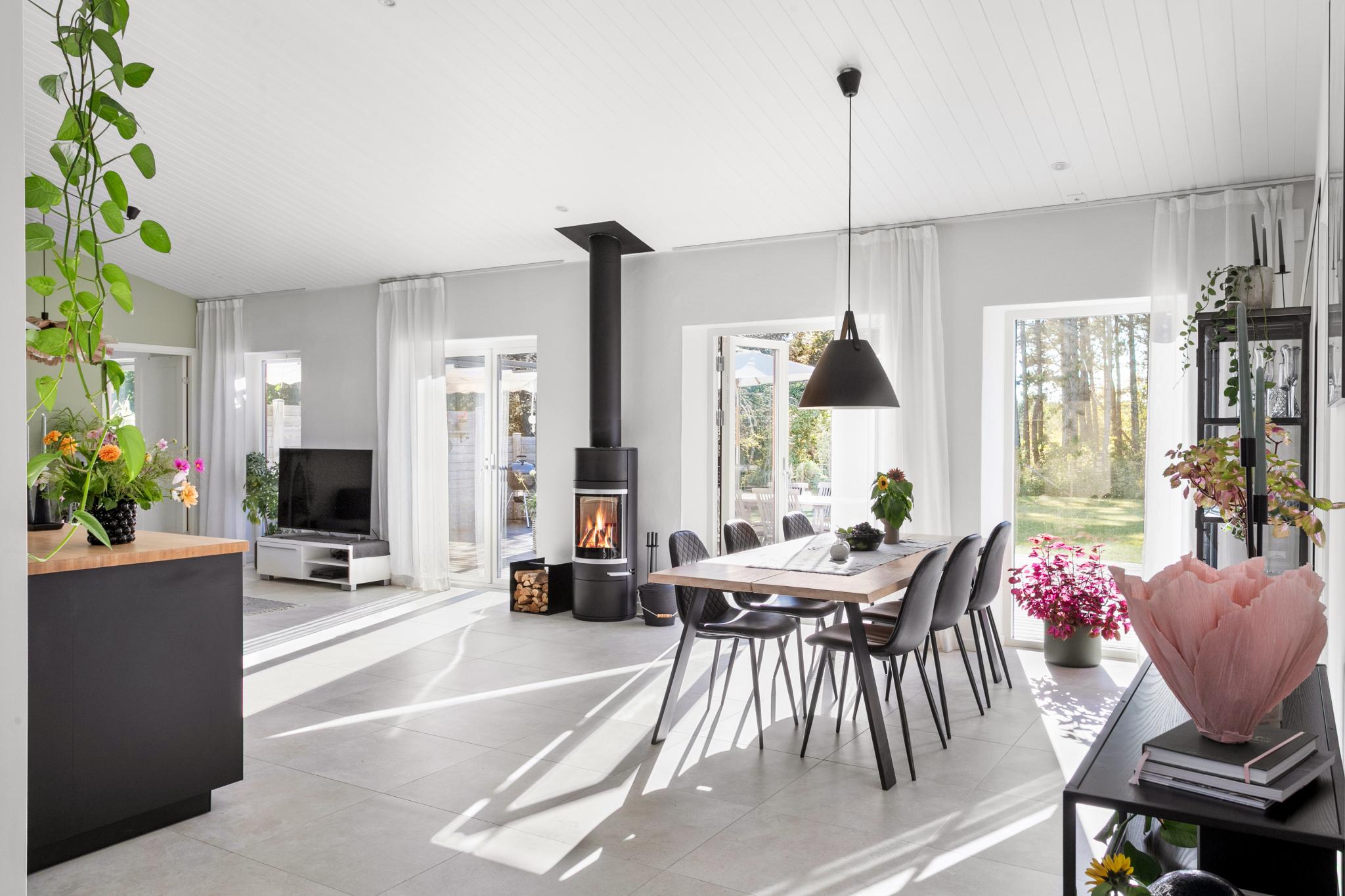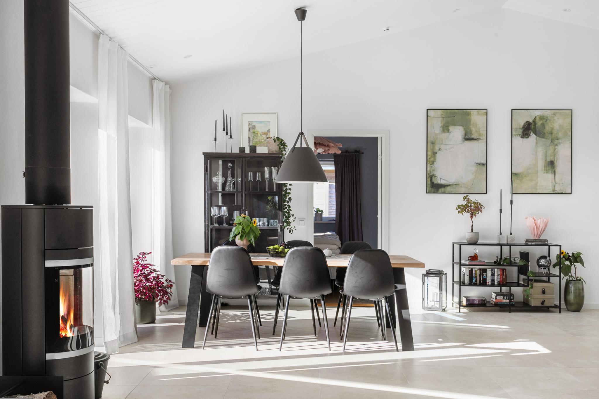 Underbart stort rum med kök, matplats och vardagsrum i härlig öppen planlösning. Rummet blir hemmets naturliga samlingspunkt med fina sällskapsytor och värmande braskamin. Två stora höga fönster och två dubbla fönsterdörrar ut mot altanen ger fint ljusinsläpp. Här njuter du av utsikten över trädgården och naturen.