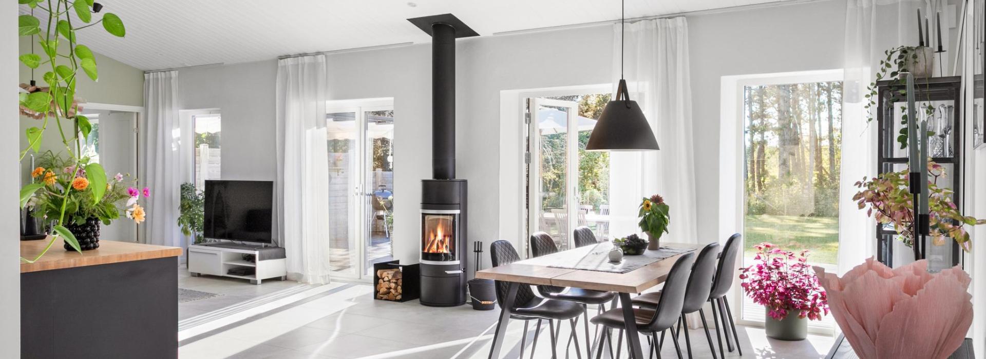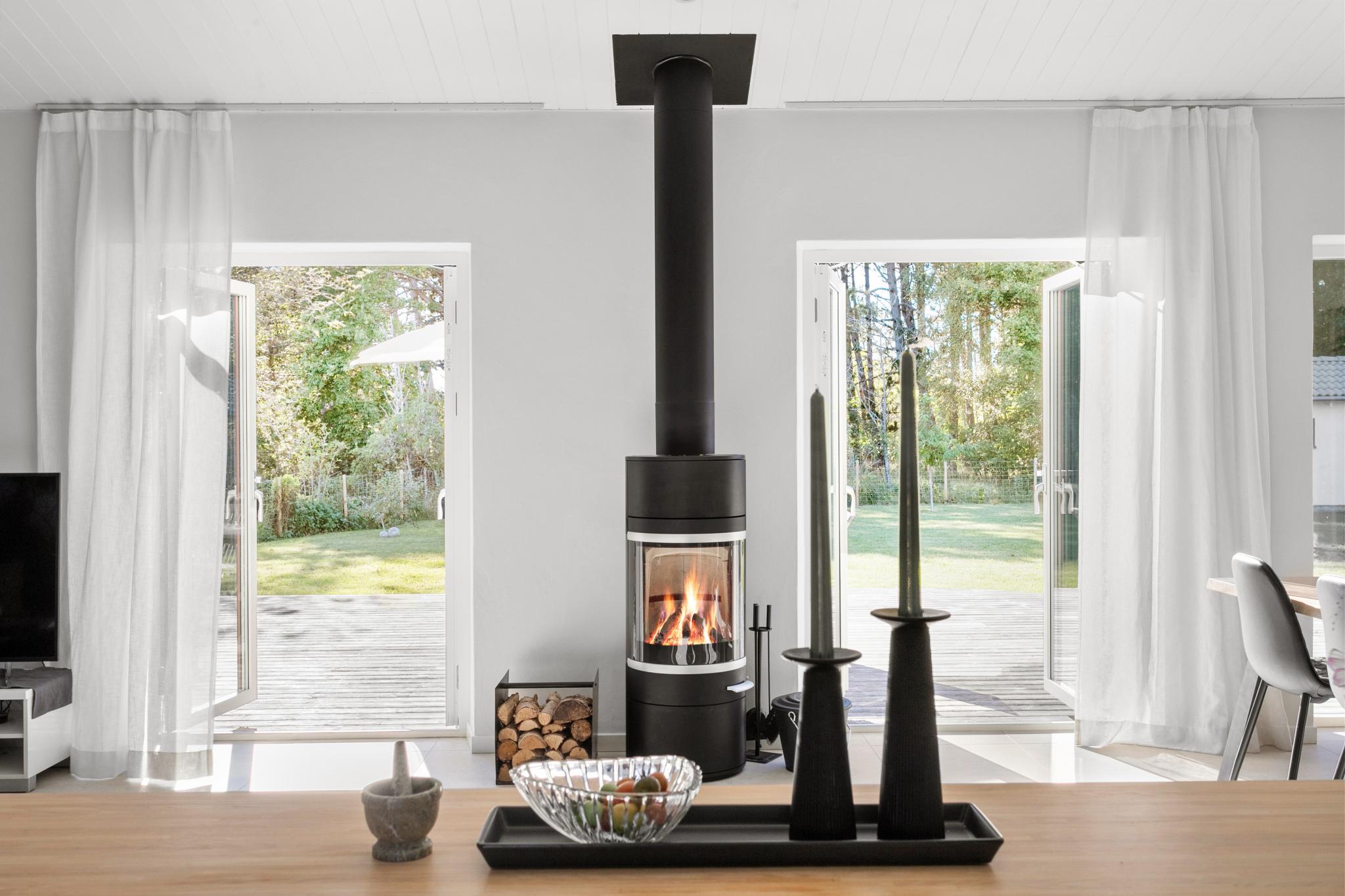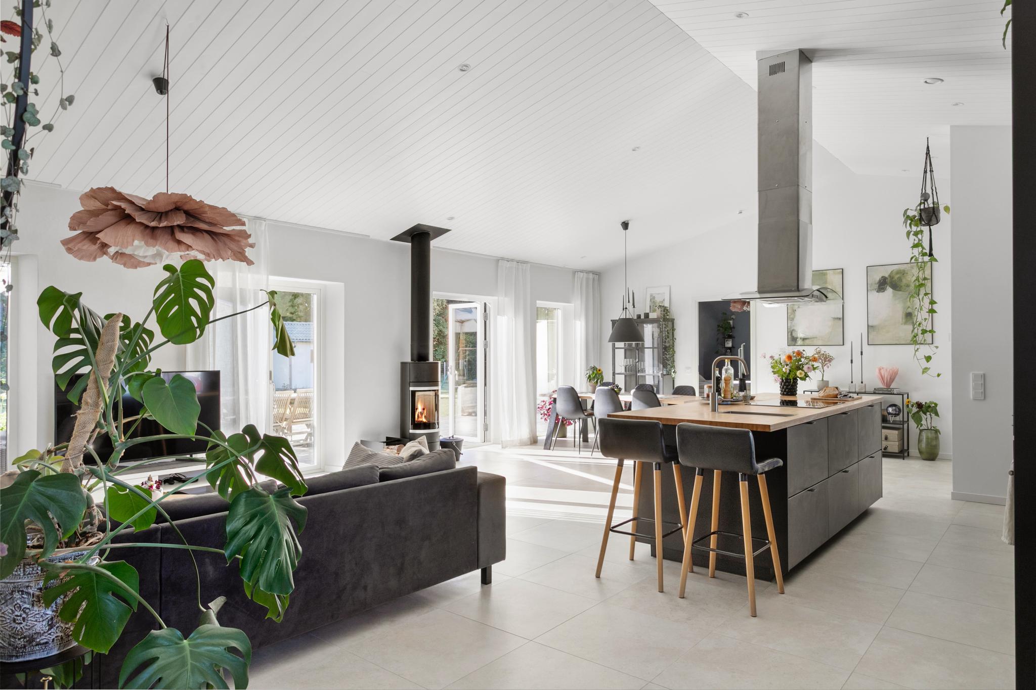 Underbart stort rum med kök, matplats och vardagsrum i härlig öppen planlösning. Rummet blir hemmets naturliga samlingspunkt med fina sällskapsytor och värmande braskamin. Två stora höga fönster och två dubbla fönsterdörrar ut mot altanen ger fint ljusinsläpp. Här njuter du av utsikten över trädgården och naturen.