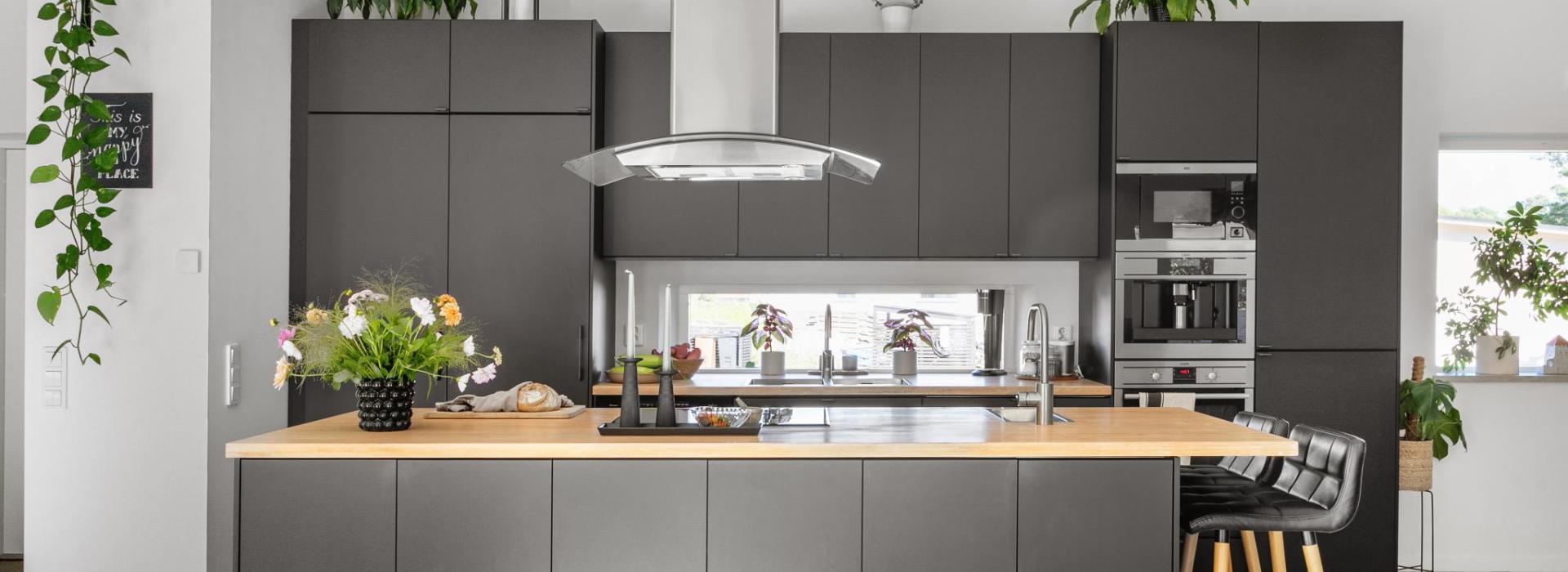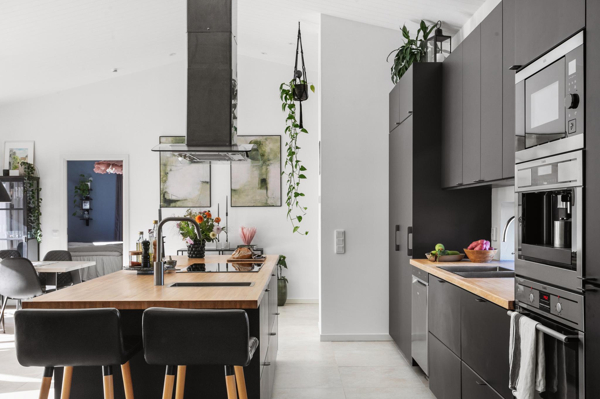 Köket är stilrent med matta luckor i mörkgrå kulör, bänkskivor i ask och rostfria vitvaror. Köket är väldisponerat och har ett smalt fönster mot huset framsida. Det finns en fin köksö i samma färg med induktionshäll, extra vask för smidig matlagning och förvaring. Här finns även sköna sittplatser för vänner att slå sig ner medan maten lagas.
