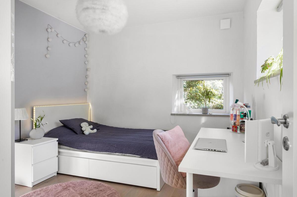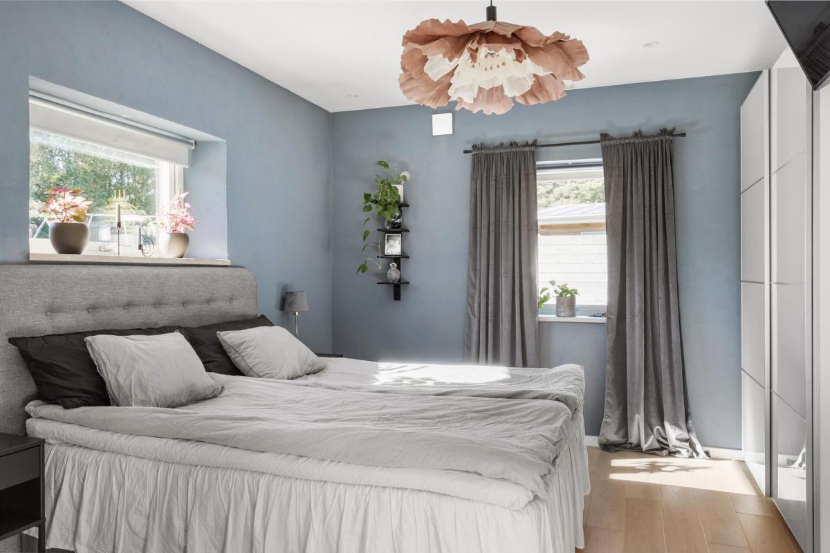 Ljust sovrum med två garderober och fönster i söder och väster.