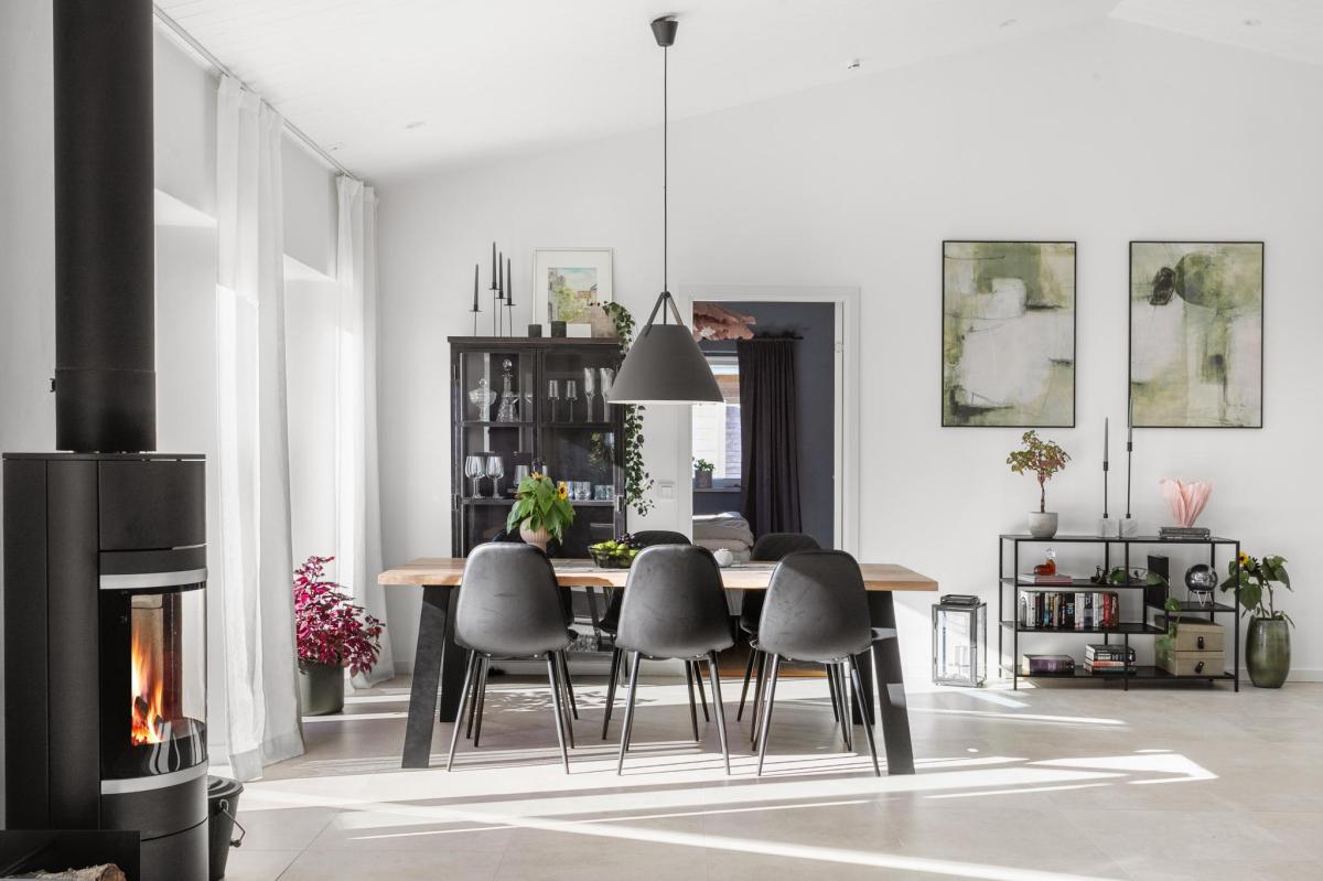 Allrummet har en rymlig matplats med plats för stort matbord och många gäster. Åt andra hållet finns vardagsrumsdelen med plats för hörnsoffa och mysig avkoppling. Den centralt placerade braskaminen syns från rummets alla delar och ger både skön värme och trivsel.
