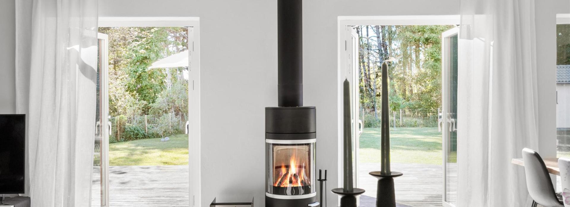 - Frånluftsvärmepump med vattenburen golvvärme. Braskamin