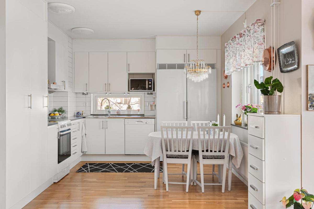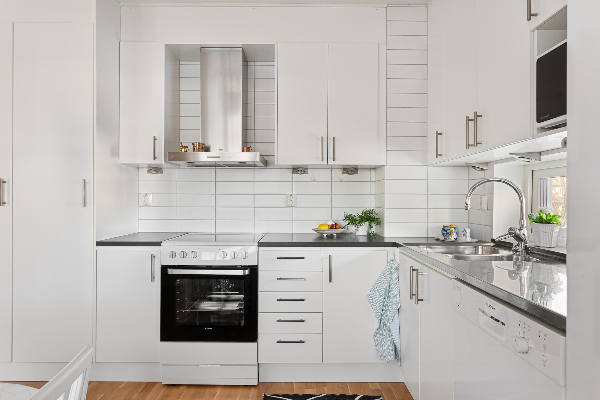 Kök och vardagsrum med öppen planlösning. Köket har en trivsam matplats vid fönster mot balkongen. Köket är fint och stilrent med vita skåpluckor, vitt kakel och gråa bänkskivor. Trevligt ljusinsläpp från fönster över arbetsbänken. Utrustning: städskåp, hällspis, spisfläkt, inbyggd mikrovågsugn, diskmaskin, kyl/frys och städskåp.