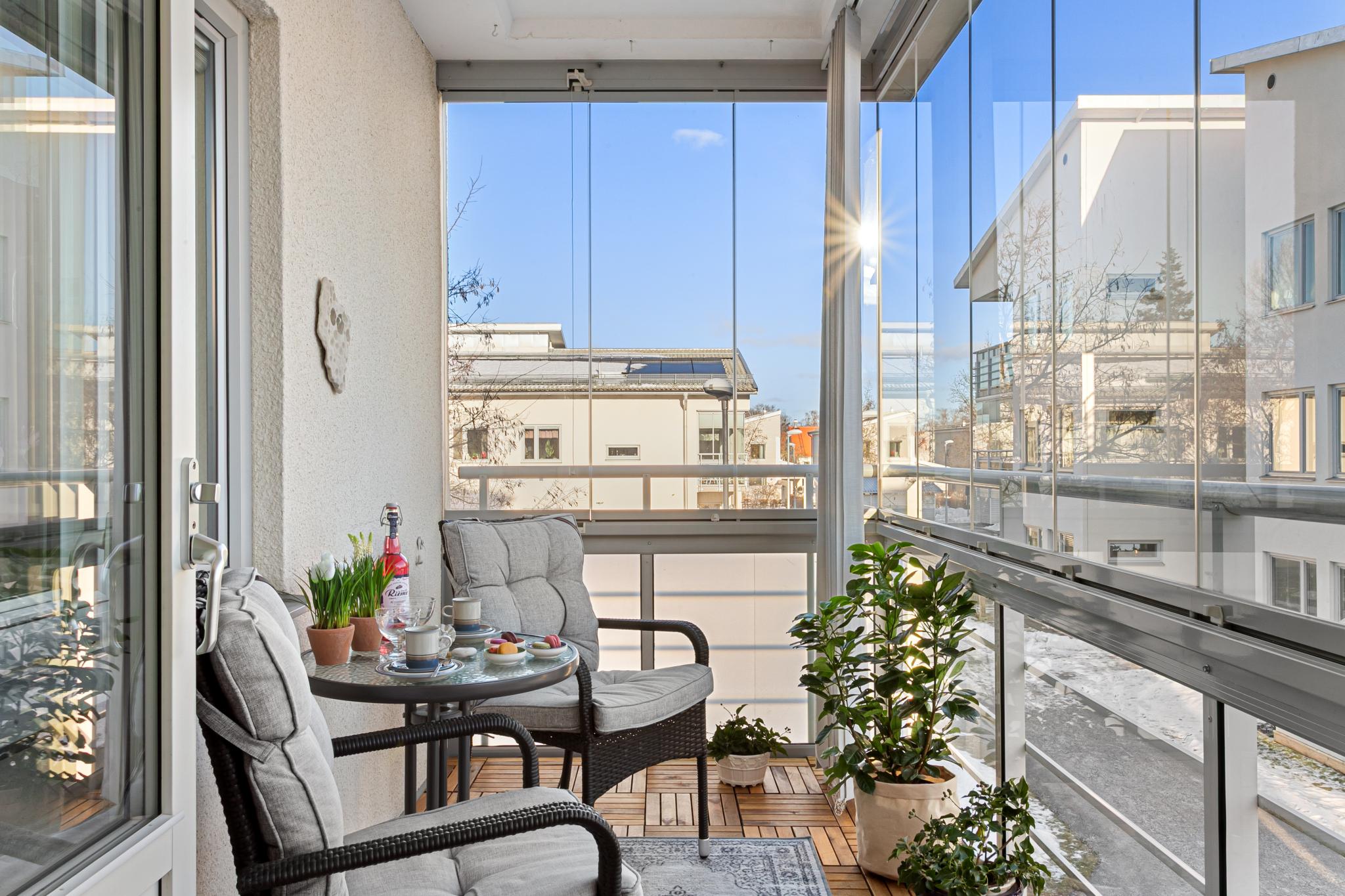 Inglasad balkong som du kan nyttja från tidig vår till sent på hösten.