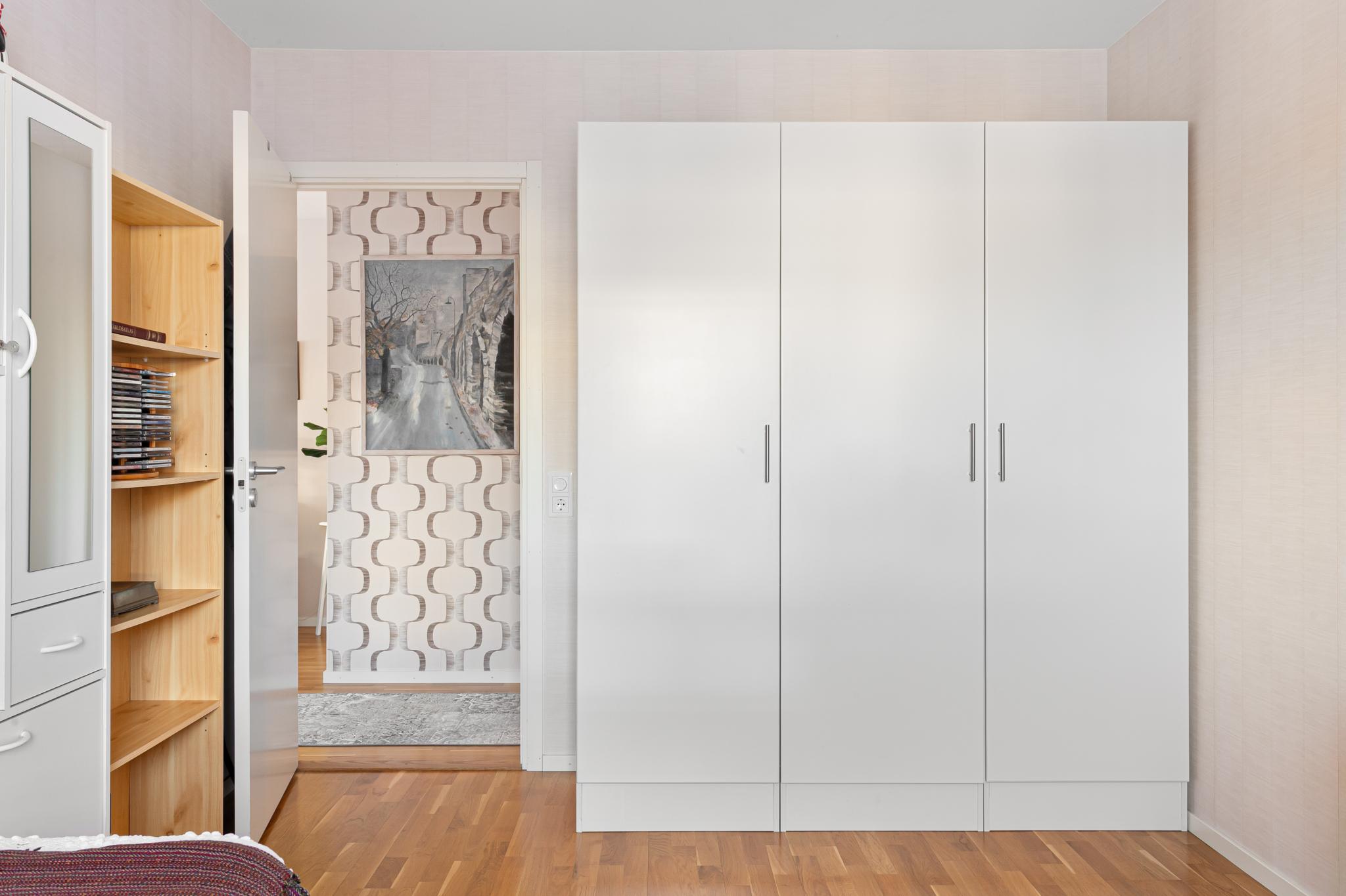 Sovrum med gott om förvaring i två garderober och ett linneskåp.