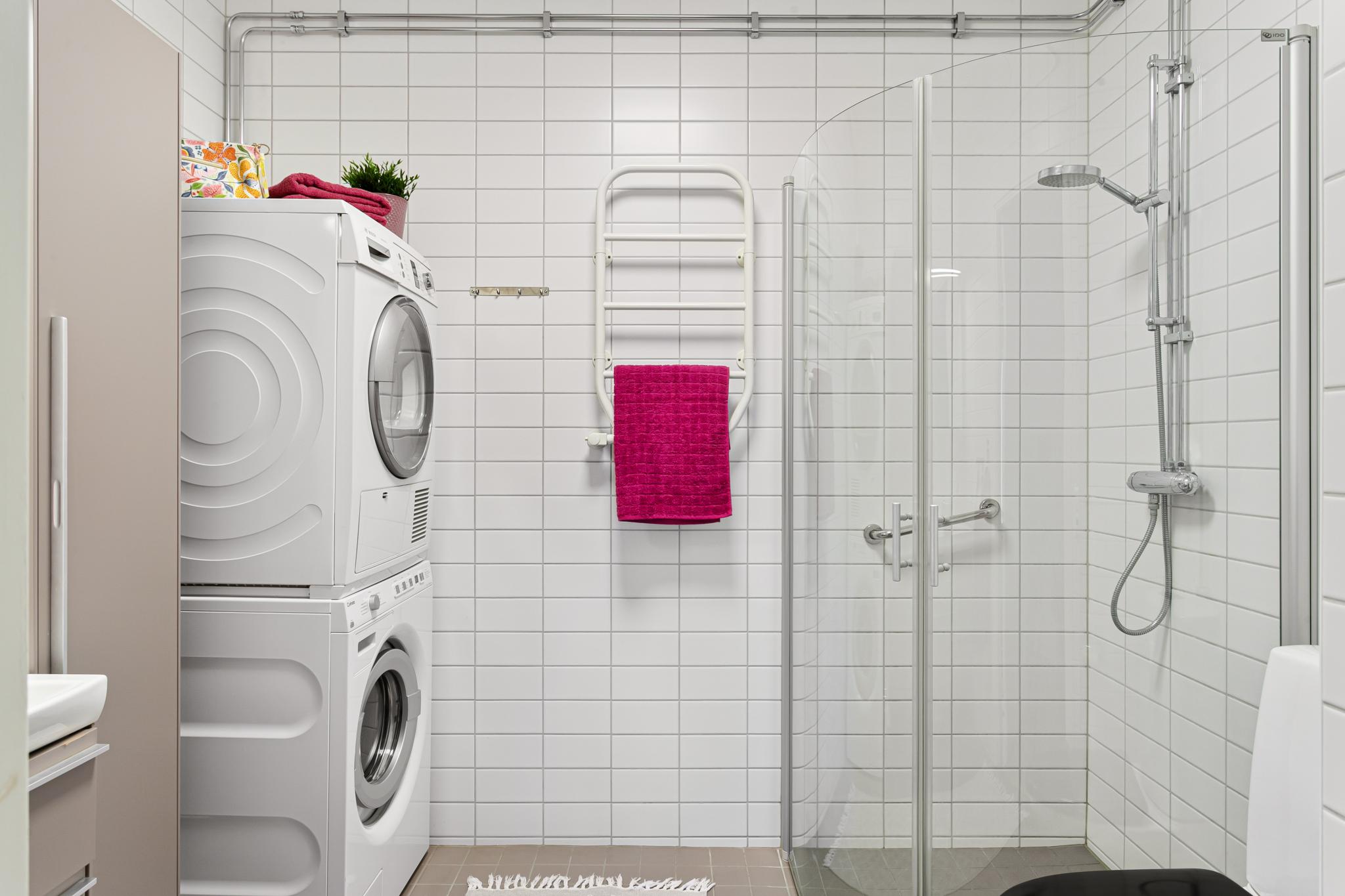 Fräscht och rymligt badrum med vita helkaklade väggar och klinkergolv i neutral färg med golvvärme. Utrustning: tvättkommod, spegelskåp, högskåp, tvättmaskin, torktumlare, handdukstork, dusch med vikbara glasdörrar och wc.
