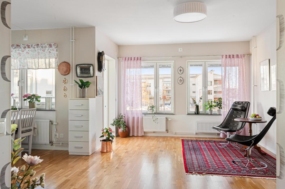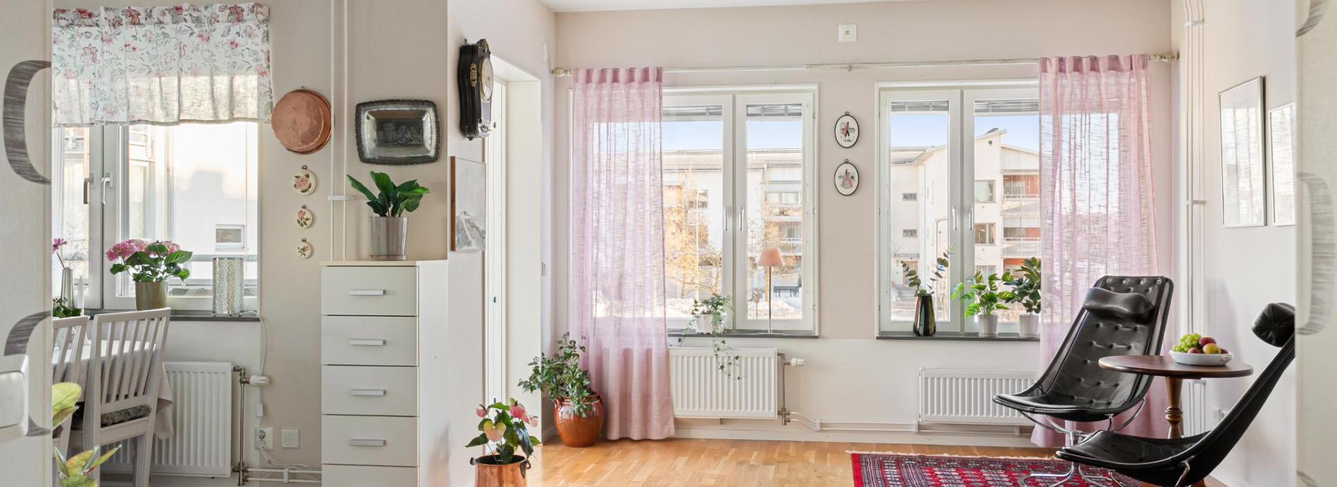 Fint vardagsrum med två stora fönster och utgång till den inglasade balkongen.