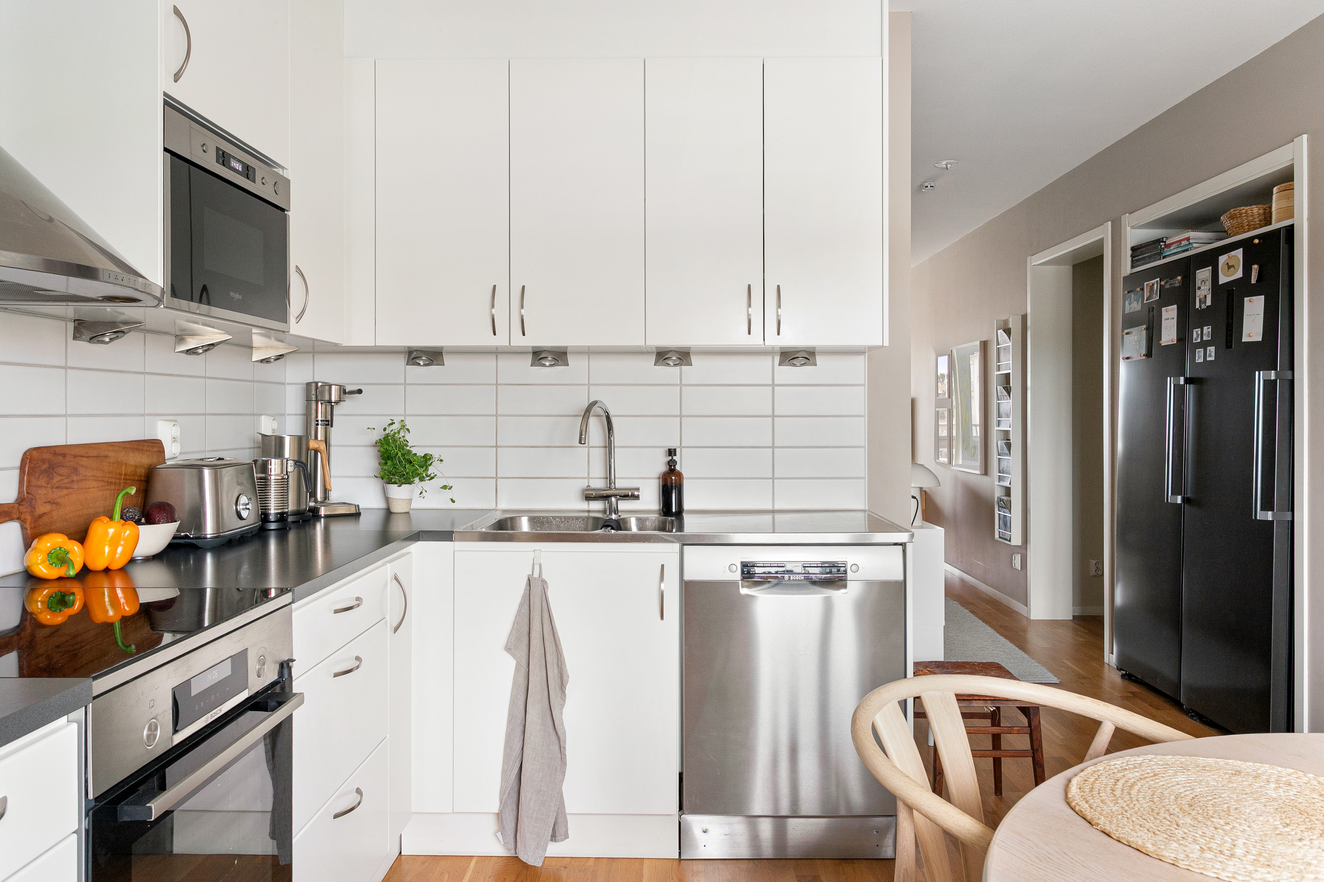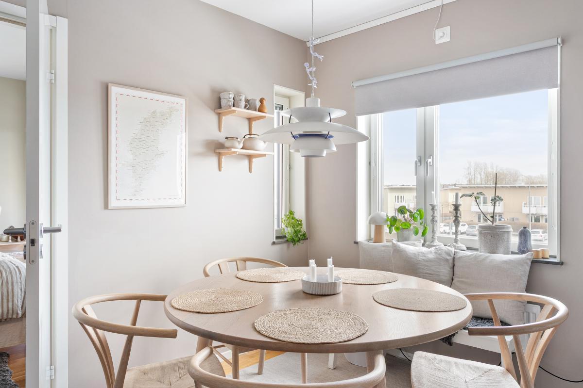 Stilrent och väldisponerat kök som efter ombyggnad 2020 fått bättre skåp- och bänkutrymmen. Bra matplats vid fönster och modernt utrustat med inbyggd mikrovågsugn, diskmaskin, induktionshäll, varmluftsugn, spisfläkt samt separat kyl och frys. Samtliga vitvaror utbytta i samband med ombyggnad 2020-21.