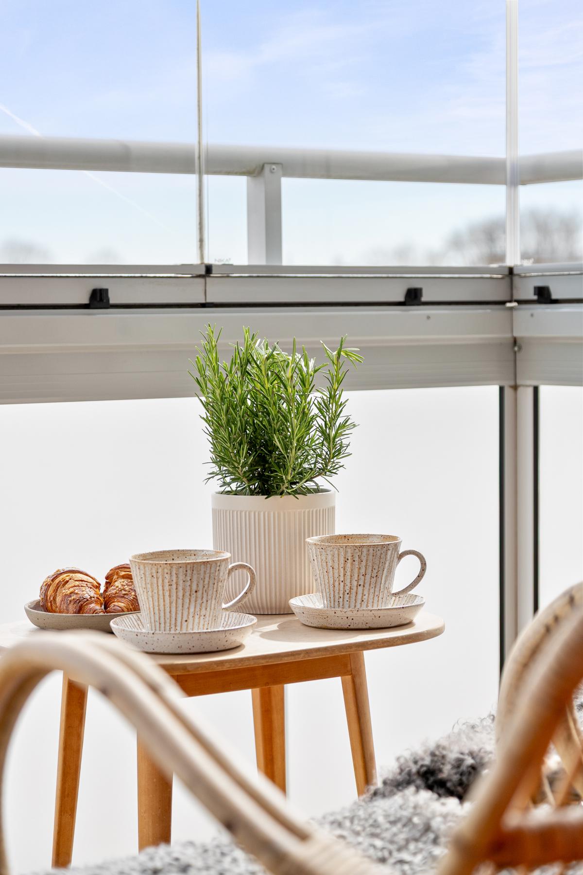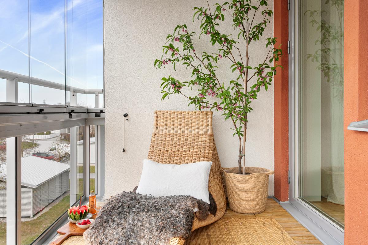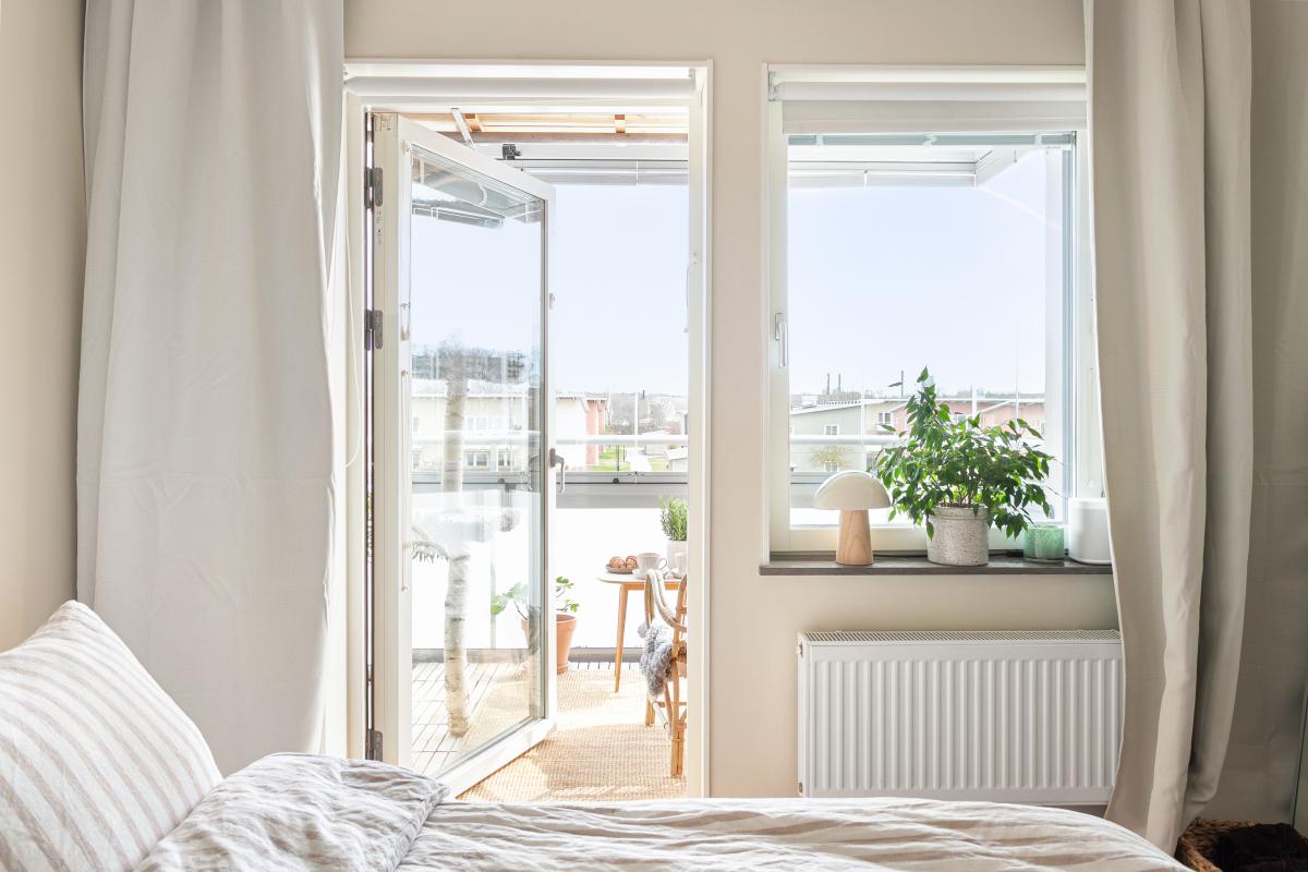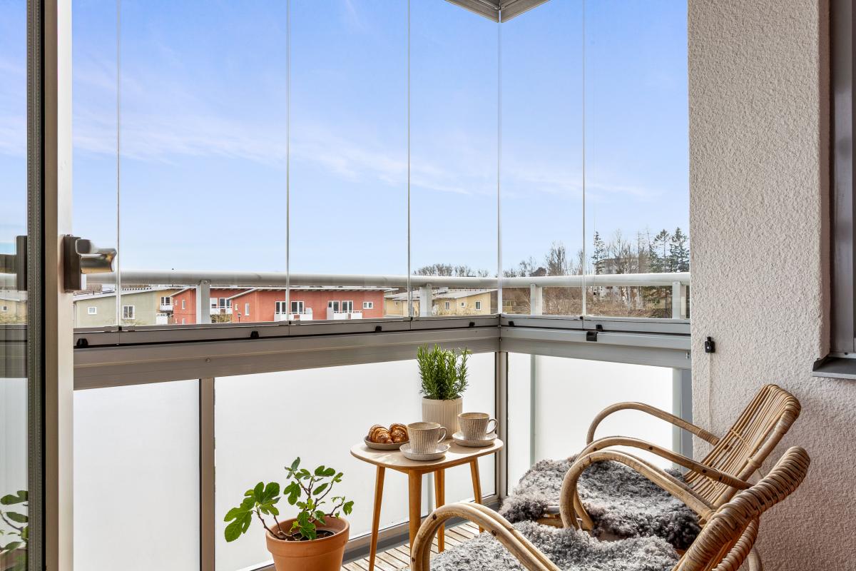 Mot morgonsolen i öst finns lägenhetens andra balkong. Även den inglasad.