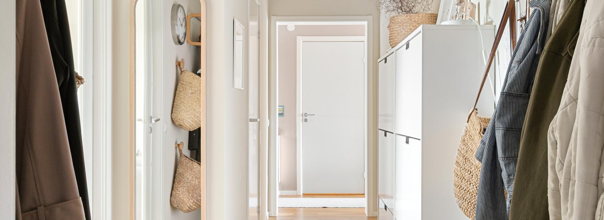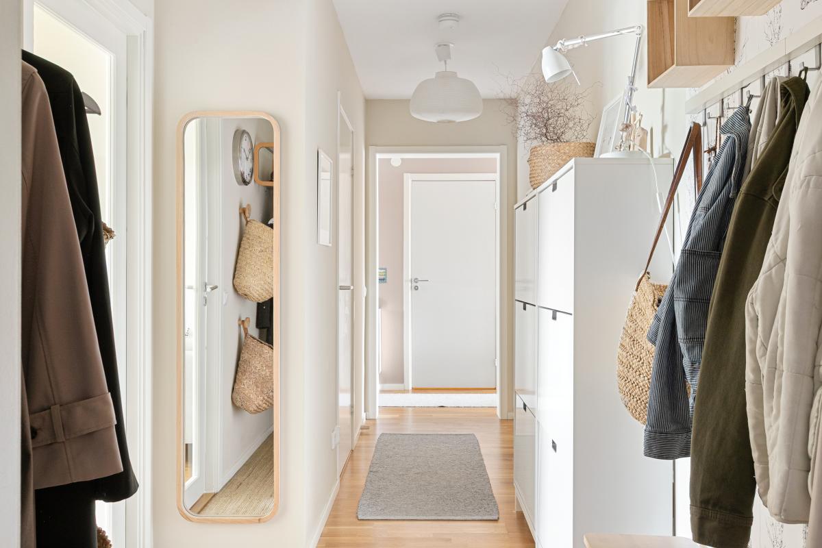 Välkomnande hall med plats för ytterkläder och skor.