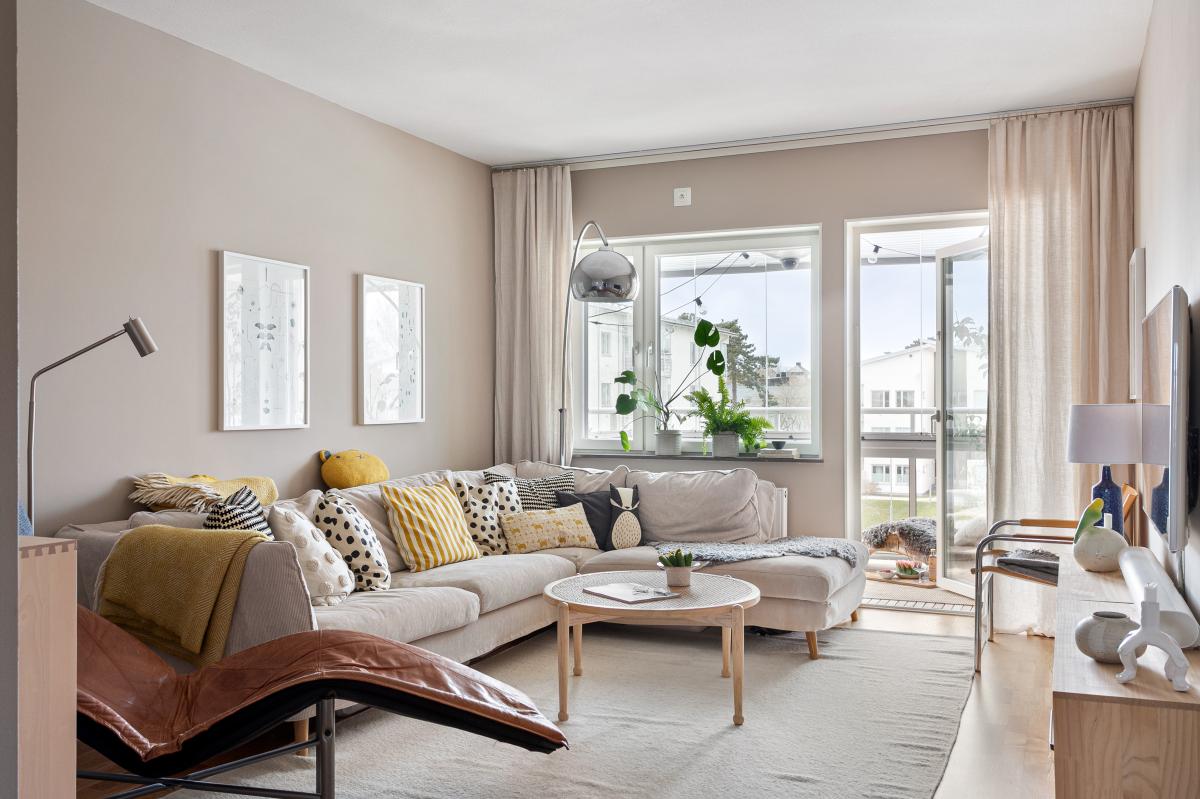 Lägenhetens vardagsrum ligger med fönster och utgång till den inglasade balkongen i skyddat västläge.
