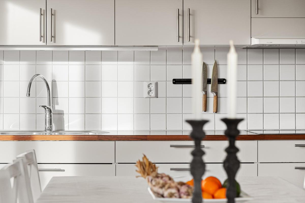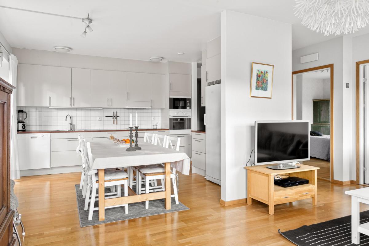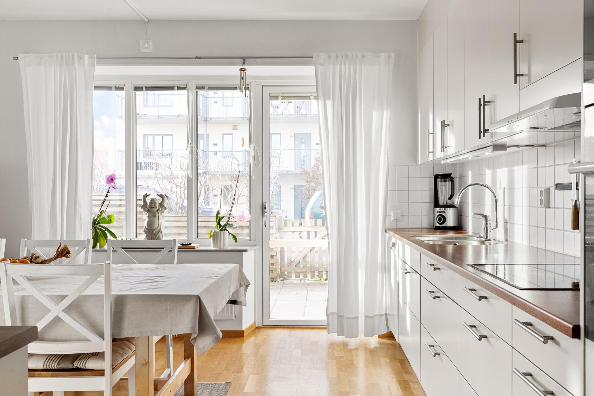Trevligt kök med fint ljusinsläpp och plats för stort matbord och många gäster. Köket är stilrent med ljusa skåpluckor, vitt kakel och mörk bänkskiva. Stort fönster och fönsterdörr till uteplats.