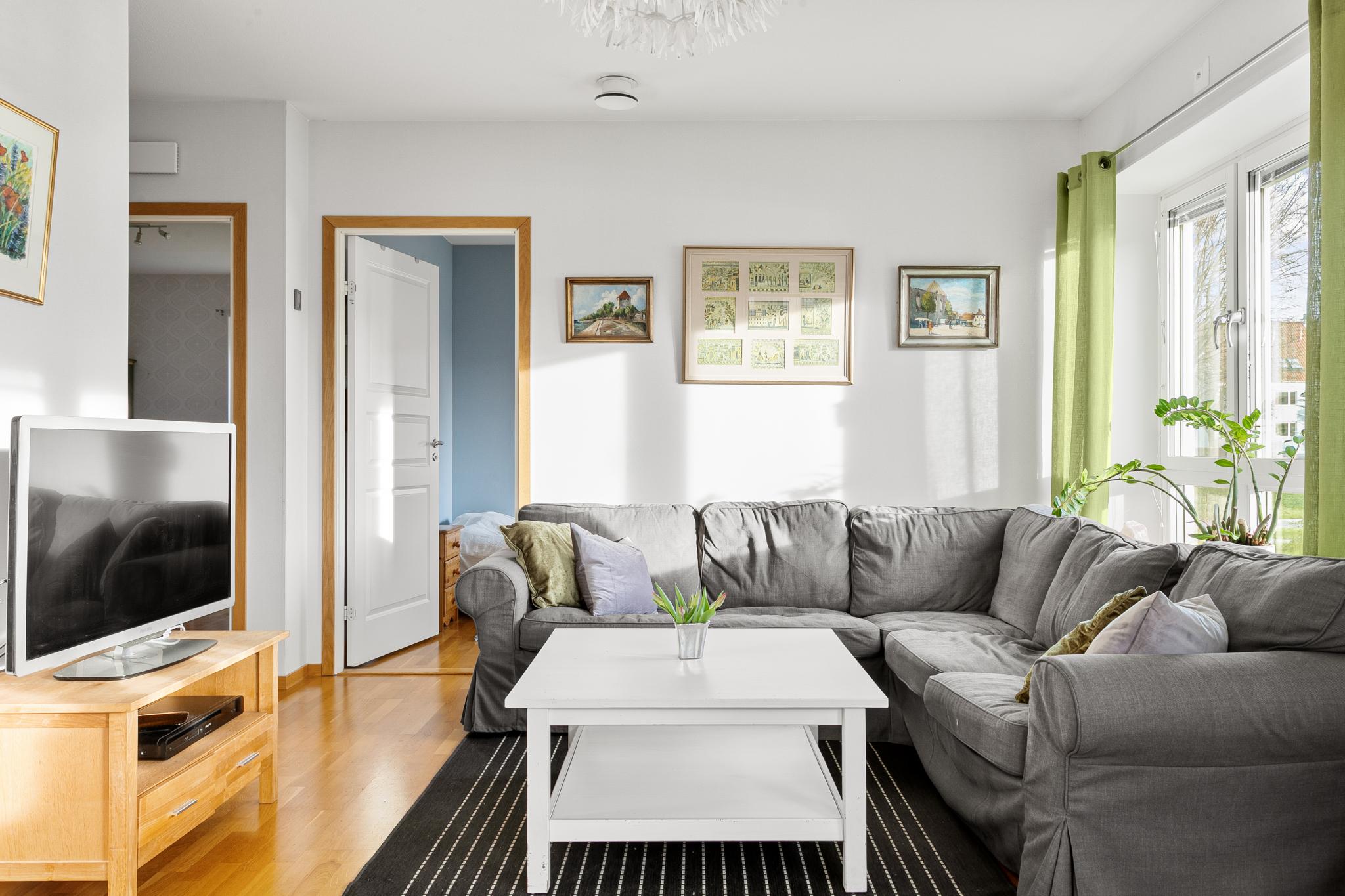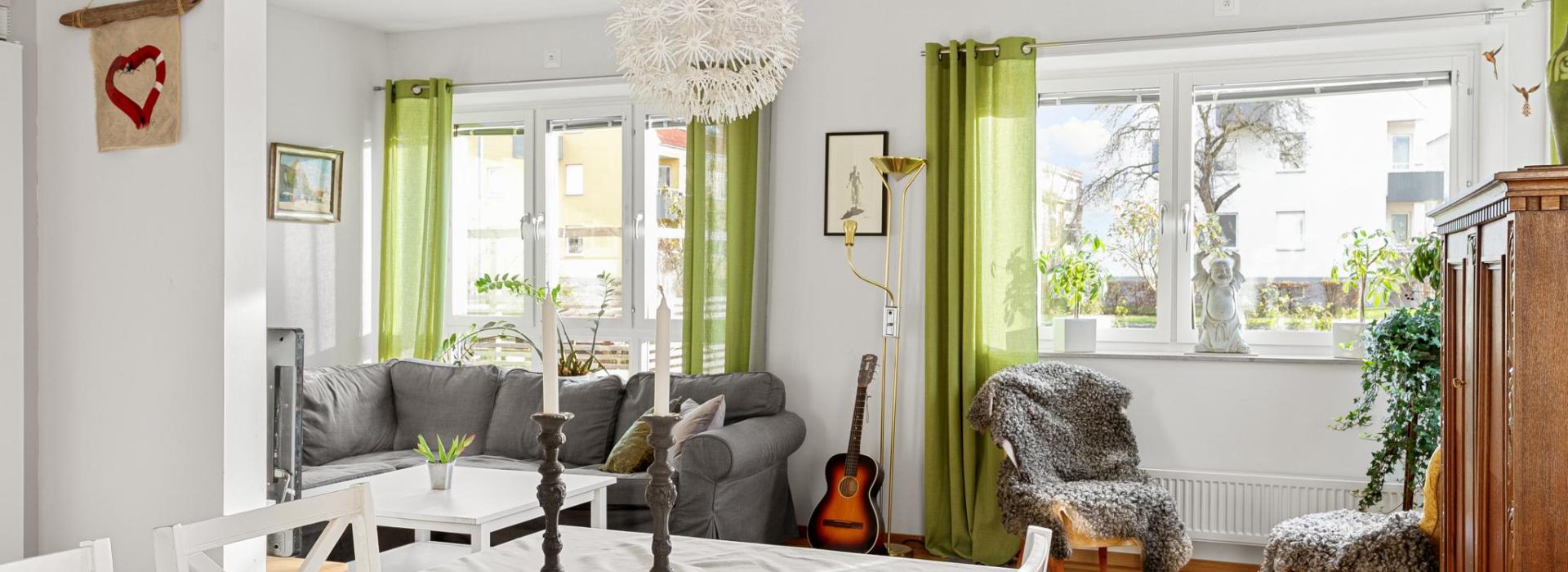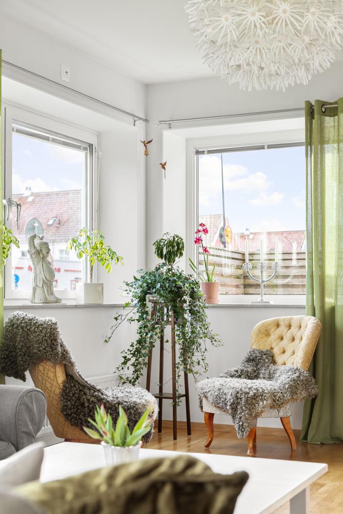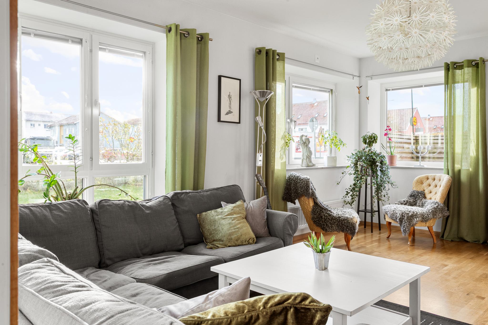 Vackert vardagsrum med plats för både soffa och fåtöljer. Rummet flödar av ljus från tre stora fönster åt två olika håll.