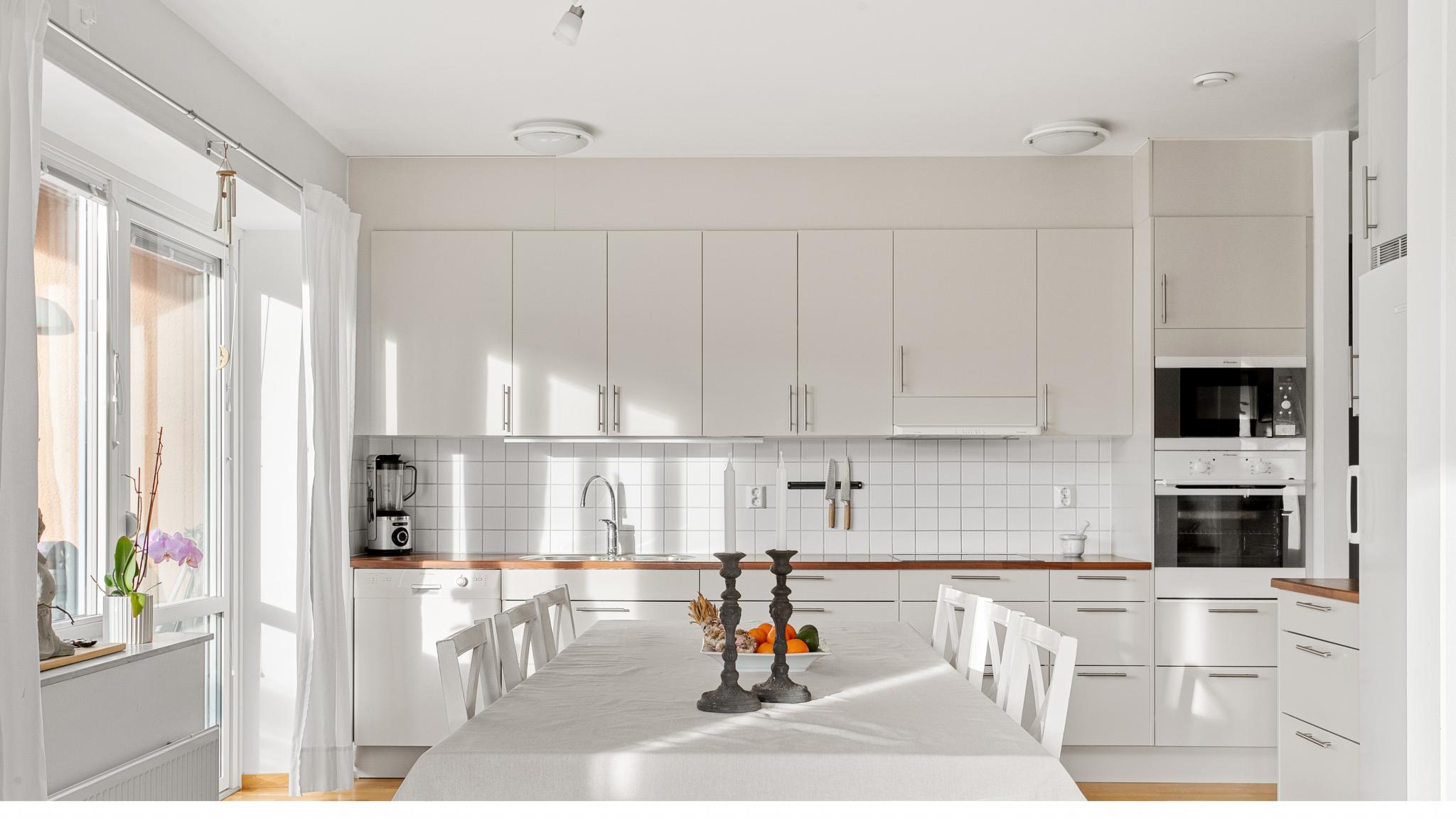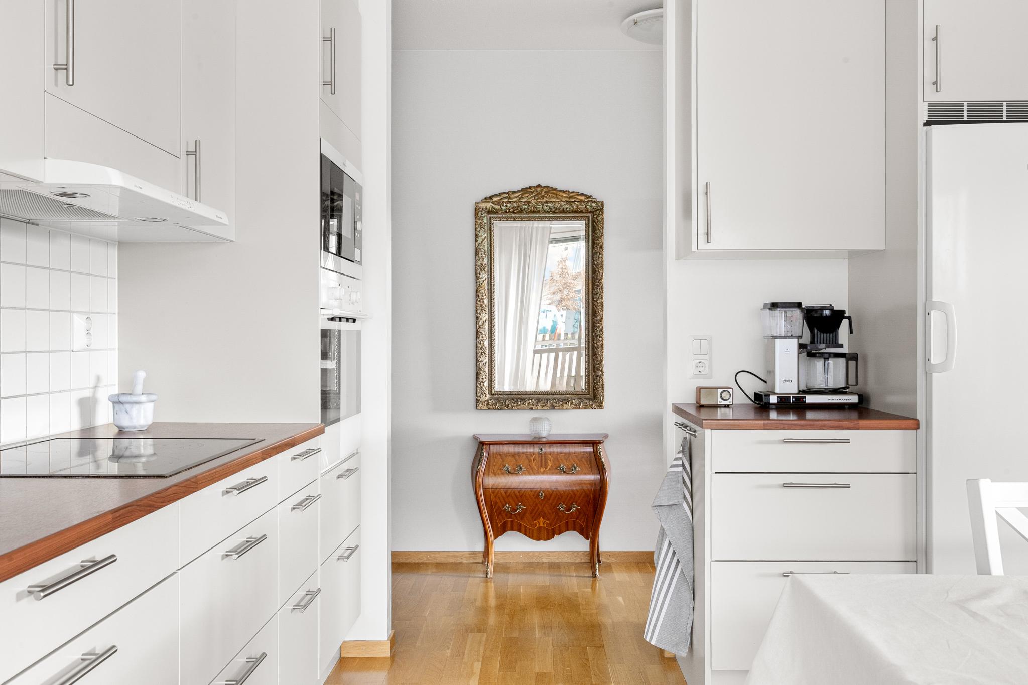 Utrustning: diskmaskin, spishäll, spisfläkt, inbyggd mikrovågsugn, inbyggd varmluftsugn, kyl och frys.