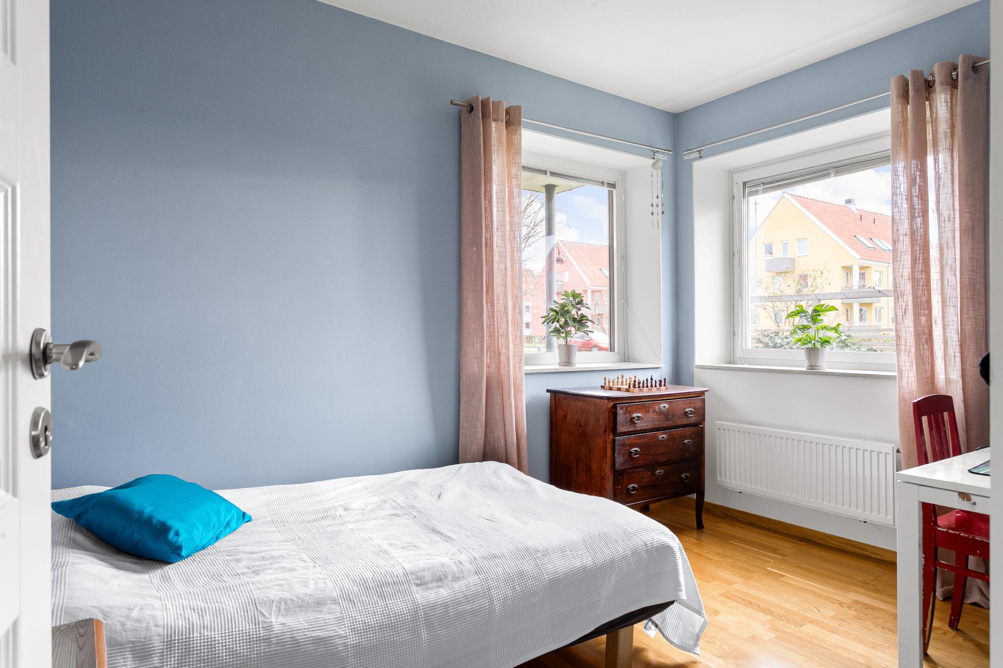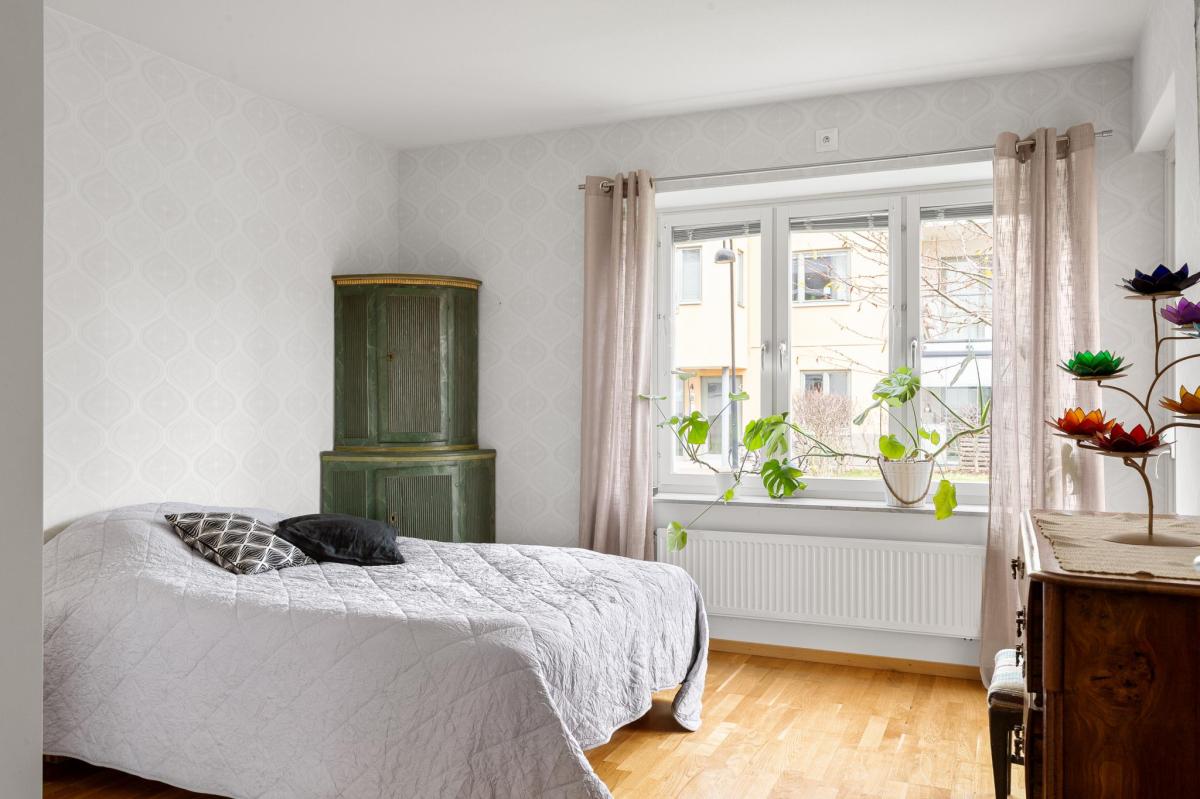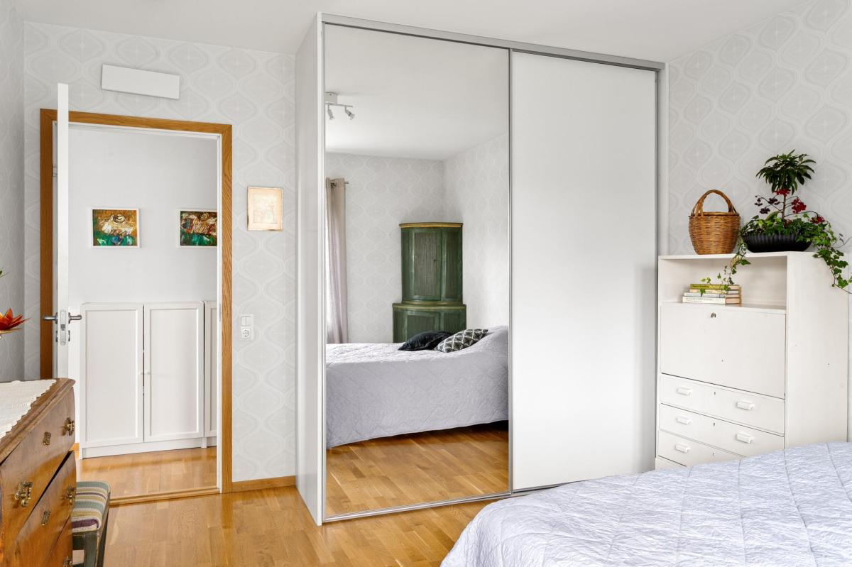 Intill badrummet ligger ett ljust sovrum med garderob.