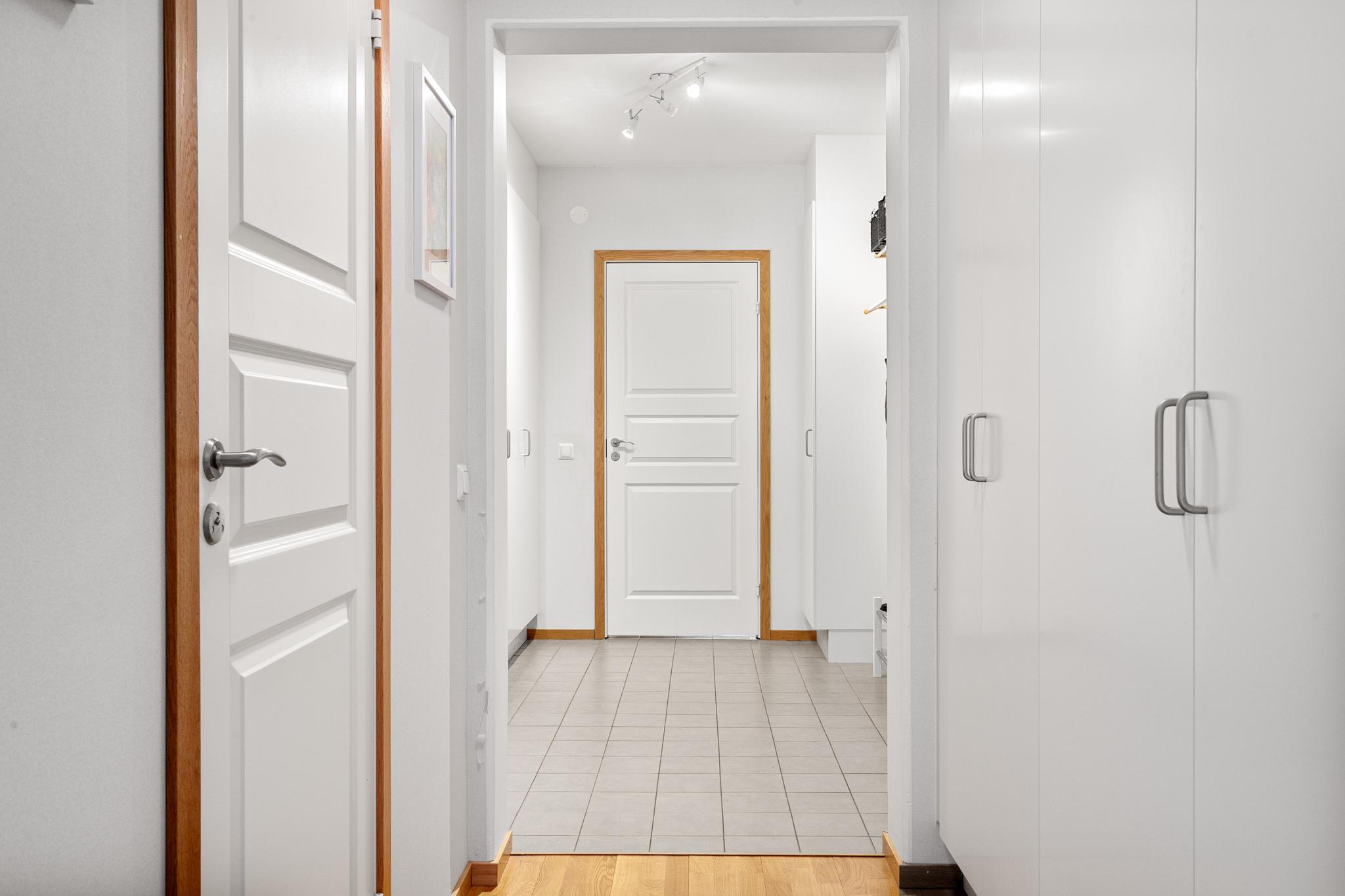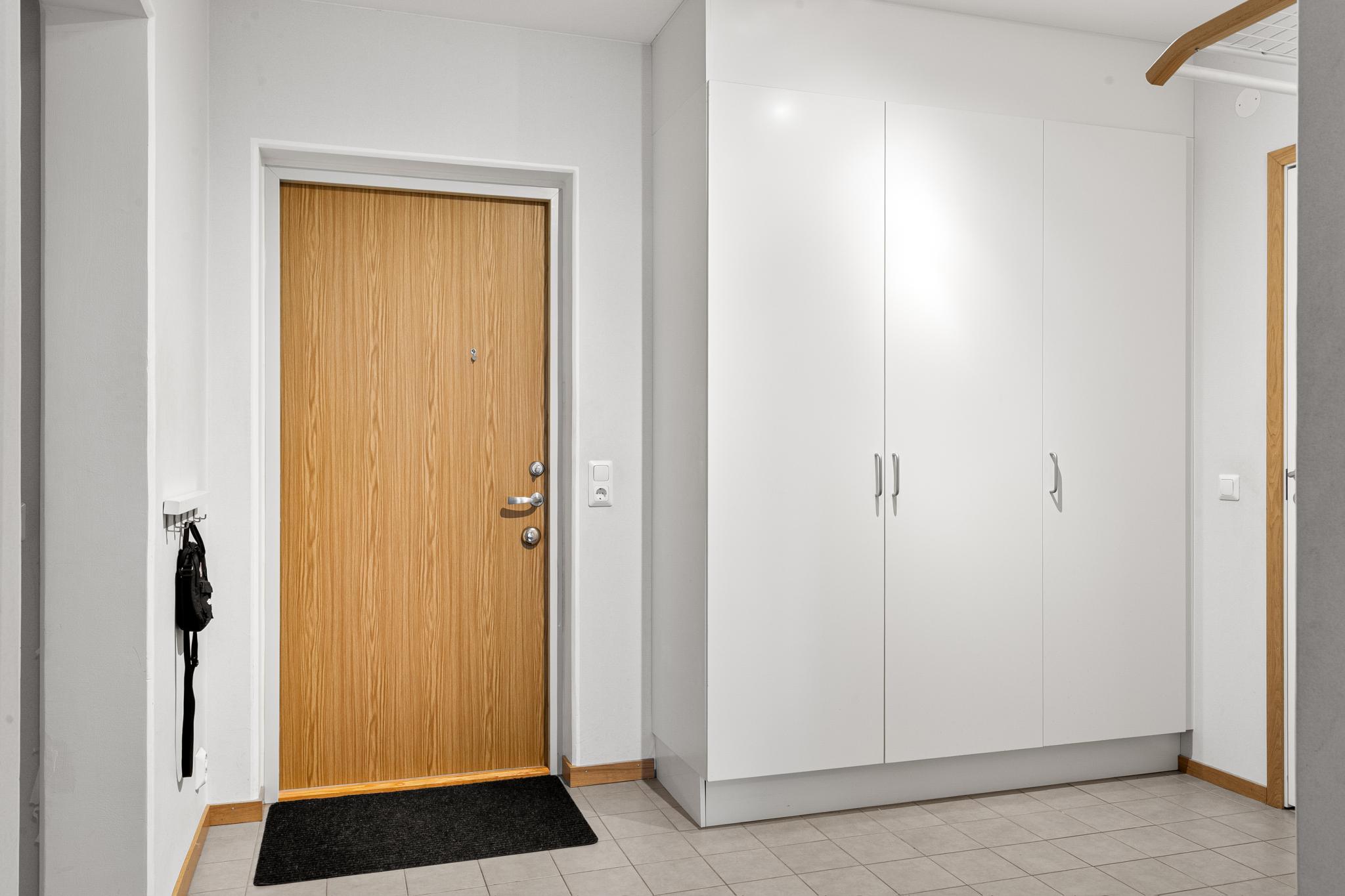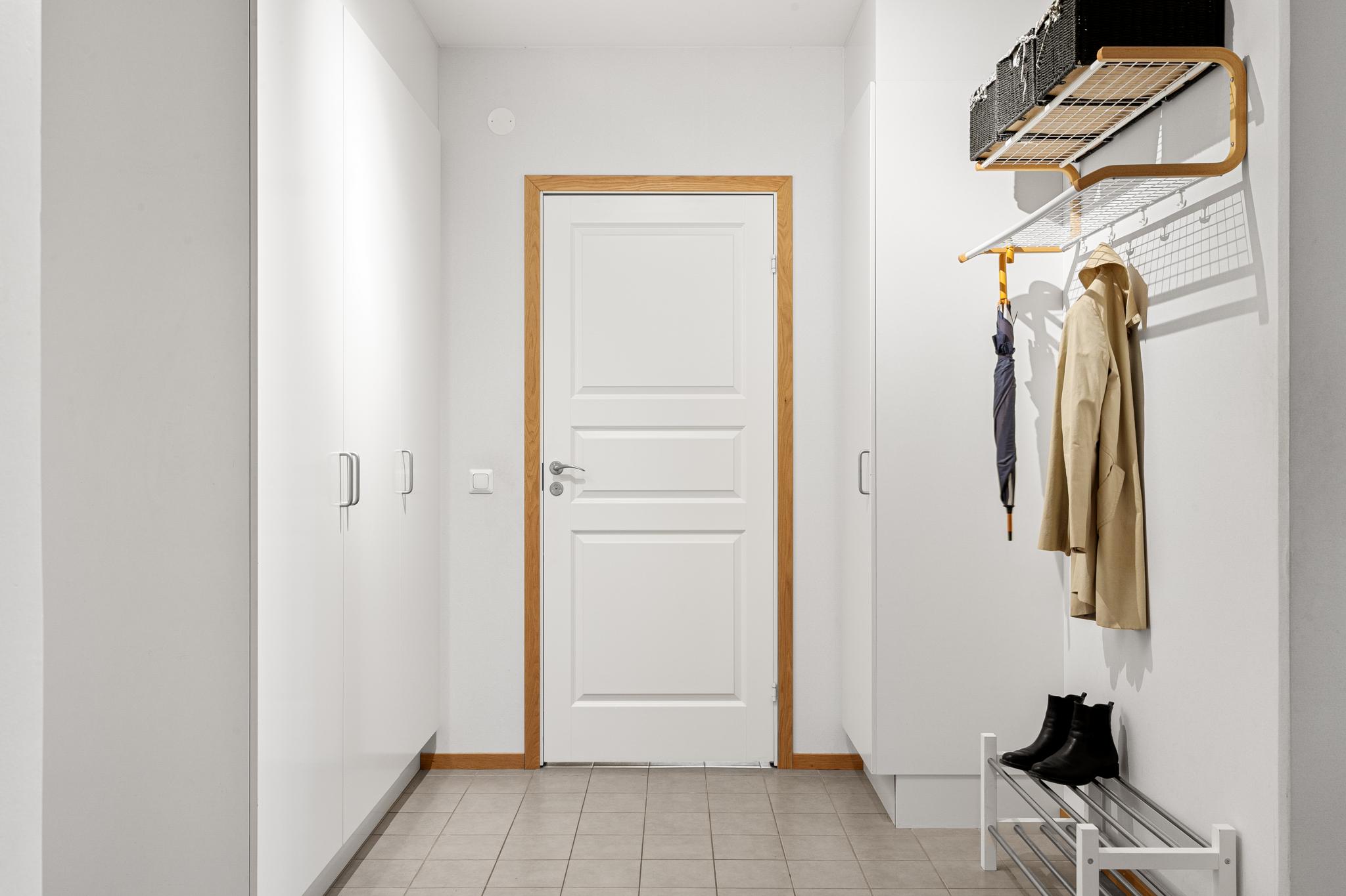 Rymlig entré/hall med hatthylla samt garderob, skåp och städskåp. Här finns även ett skåp för installationer. Till höger finns ytterligare plats för förvaring i dubbelgarderob, skåp och garderob.