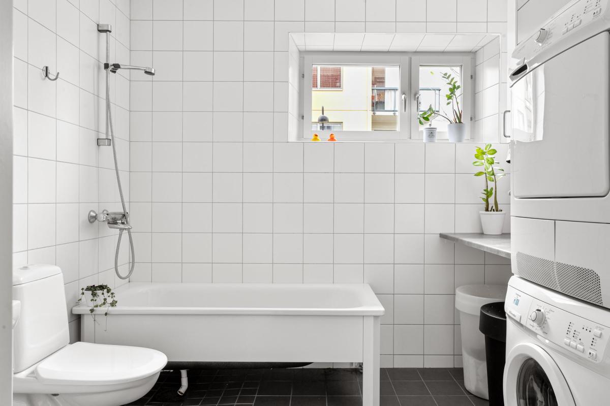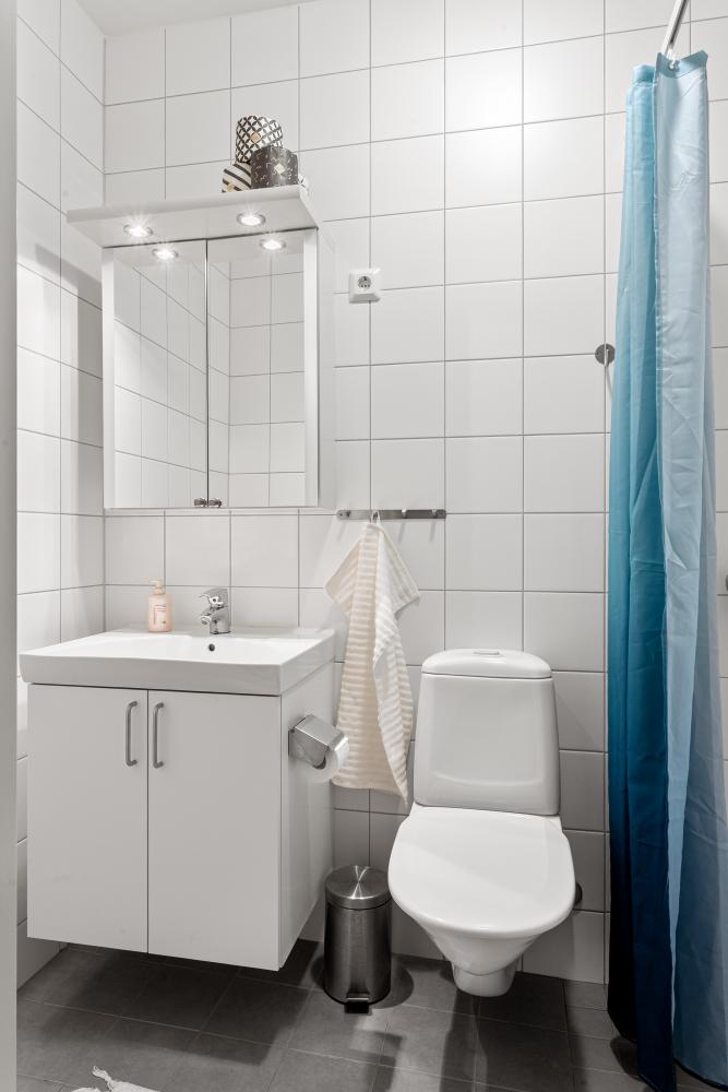 Utrustning: tvättkommod, spegelskåp, vägghängd wc, badkar, handdukstork, bänkskiva, skåp, tvättpelare (tvättmaskin och torktumlare) och skåp.