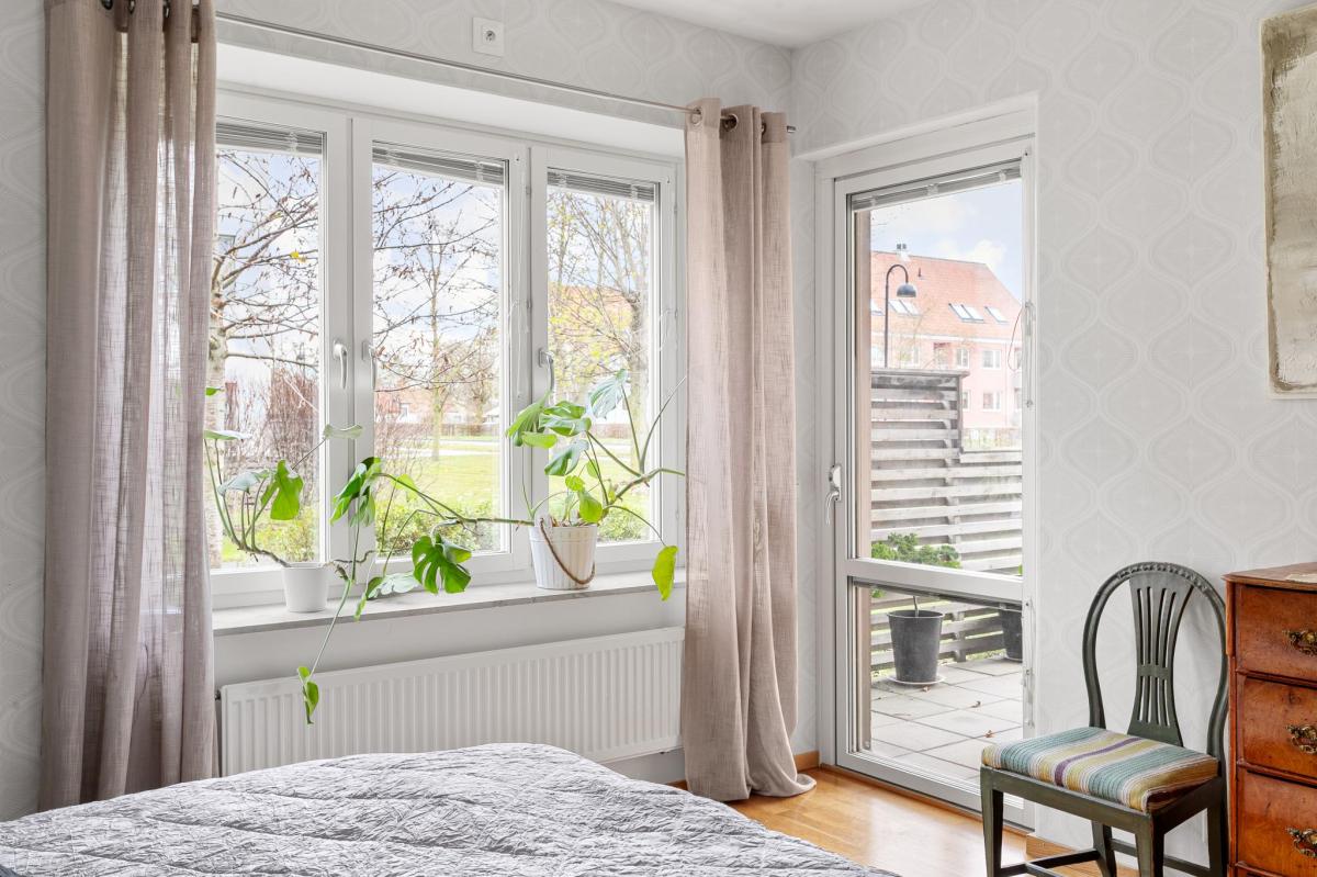 Stort sovrum med plats för dubbelsäng. Rummet har bra förvaring bakom skjutdörrar. Stort fönster och utgång till uteplats via fönsterdörr.