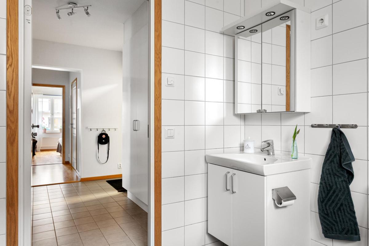 Till höger om hallen finns ett badrum utrustat med dusch. Även detta har vita helkaklade väggar och mörkt klinkergolv med golvvärme.