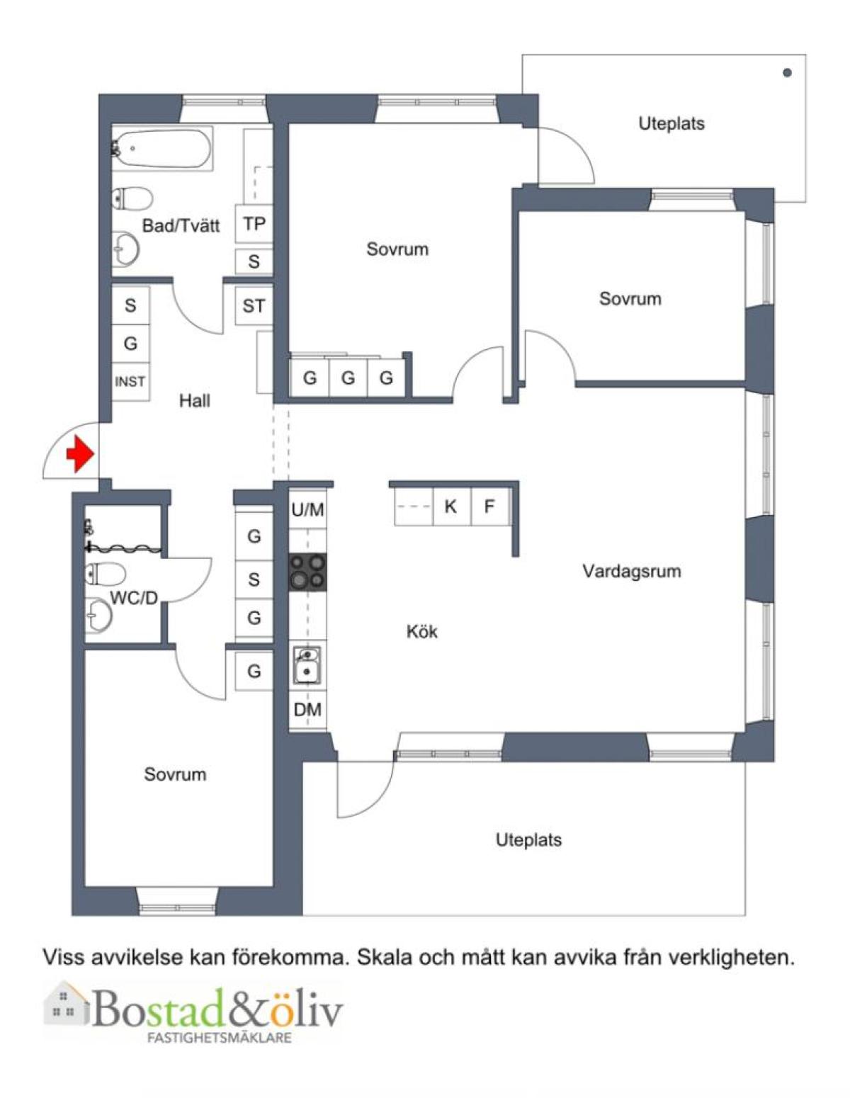 Samtliga areauppgifter är hämtade från bostadsrättsföreningen eller baserade på säljarens information. Dessa uppgifter kan av olika anledningar vara fel. Den köpare som tycker att arean har betydelse för köpet bör därför vidta en uppmätning.