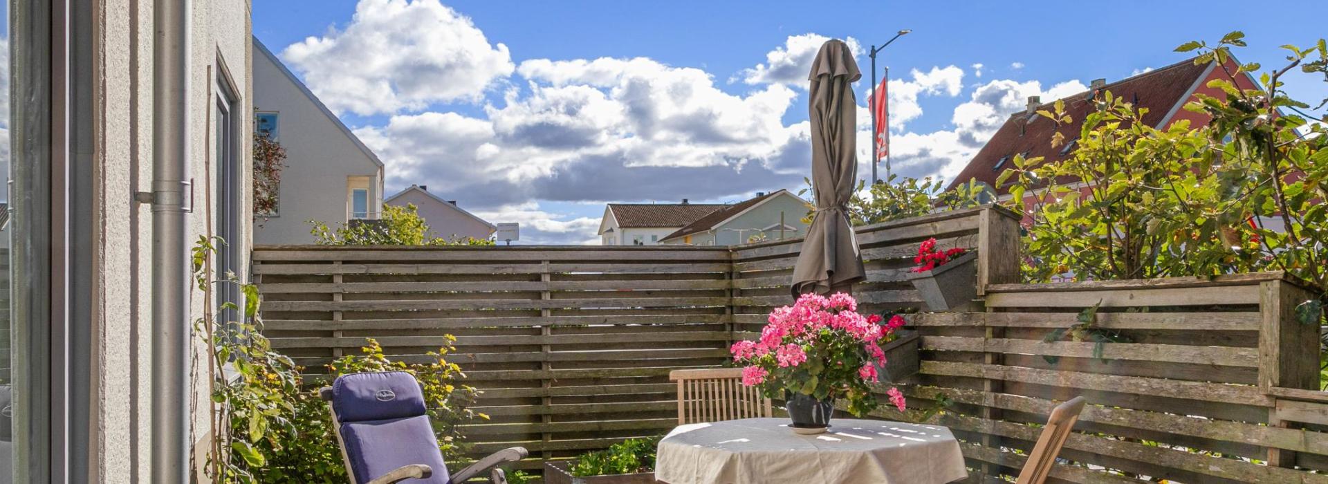 Stor stenlagd och insynsskyddad uteplats med sol hela dagen. Uteplatsen nås från köket och är fint inramad med staket och grind. Den andra skyddade uteplatsen har nordostläge. Här njuter du av morgonkaffe i solsken eller svalkande stunder varma sommardagar.