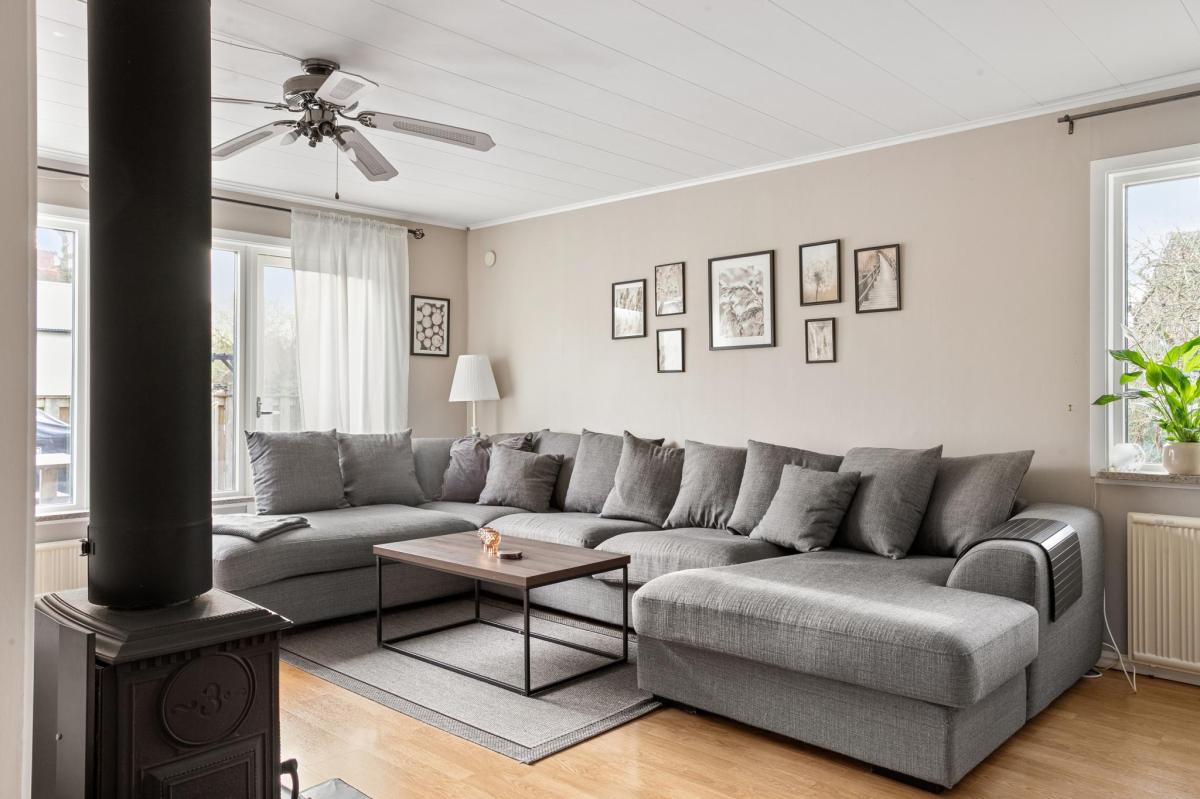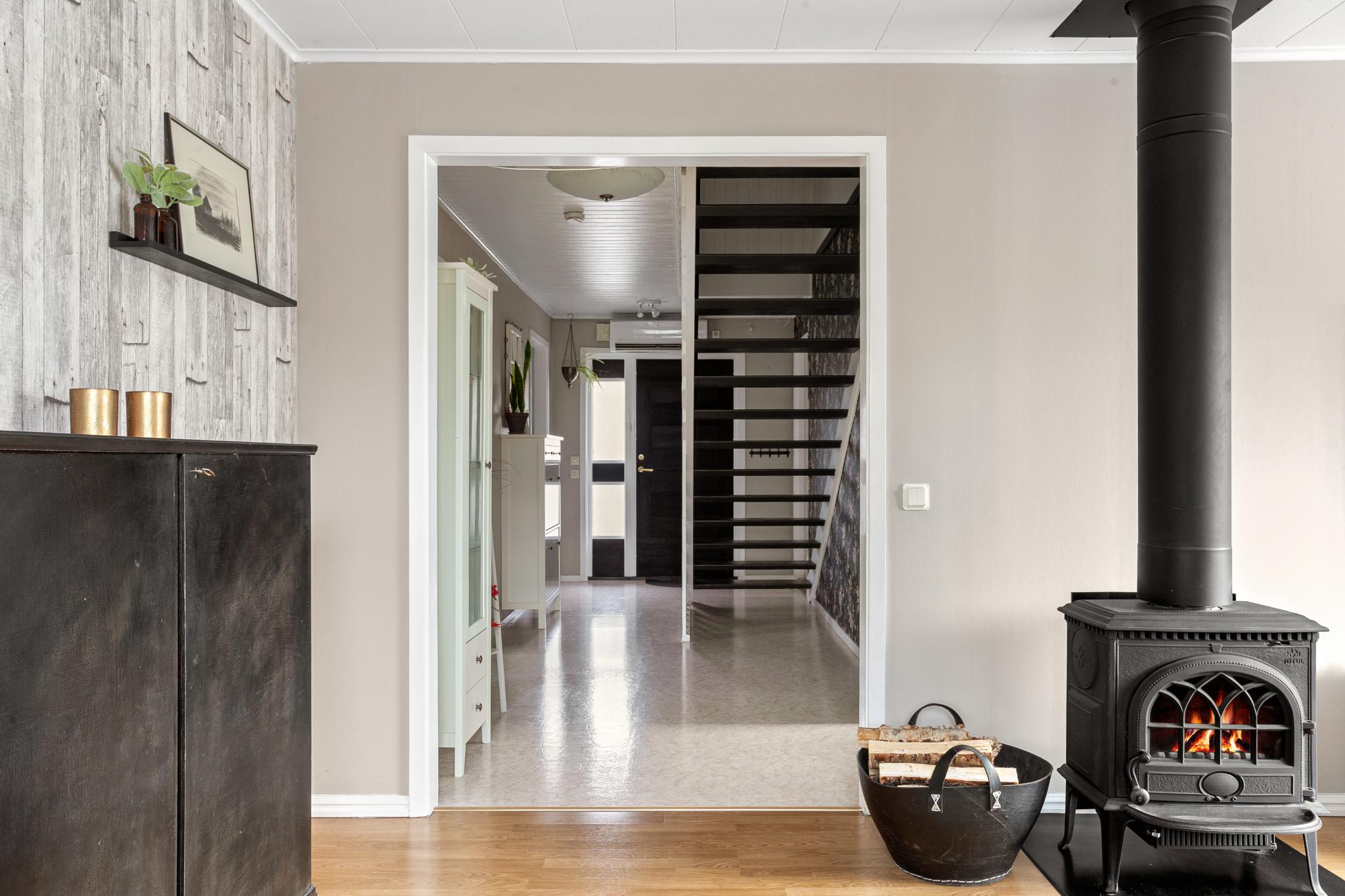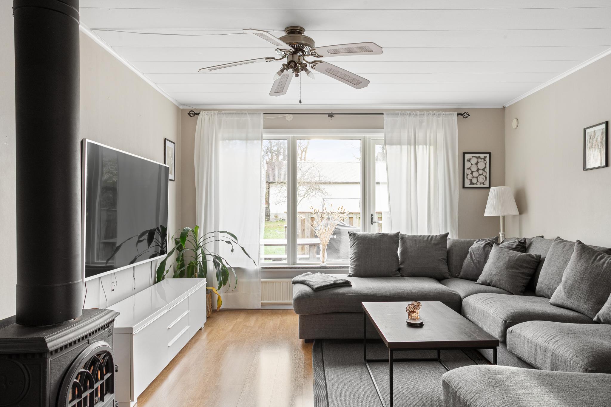 I husets vardagsrum finns plats för den stora tv-soffan, värmande braskamin samt utgång till husets trädäck och tomt.