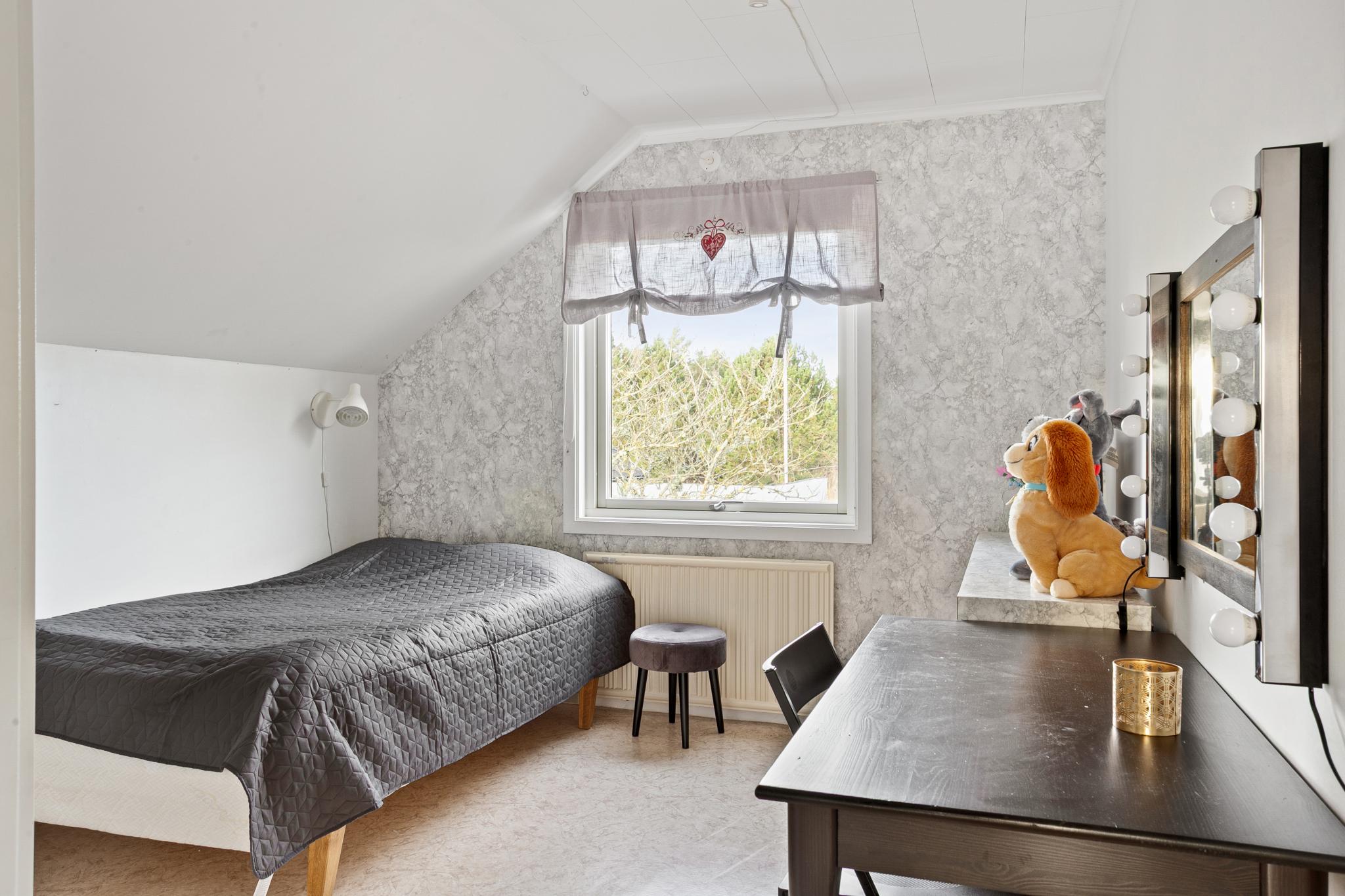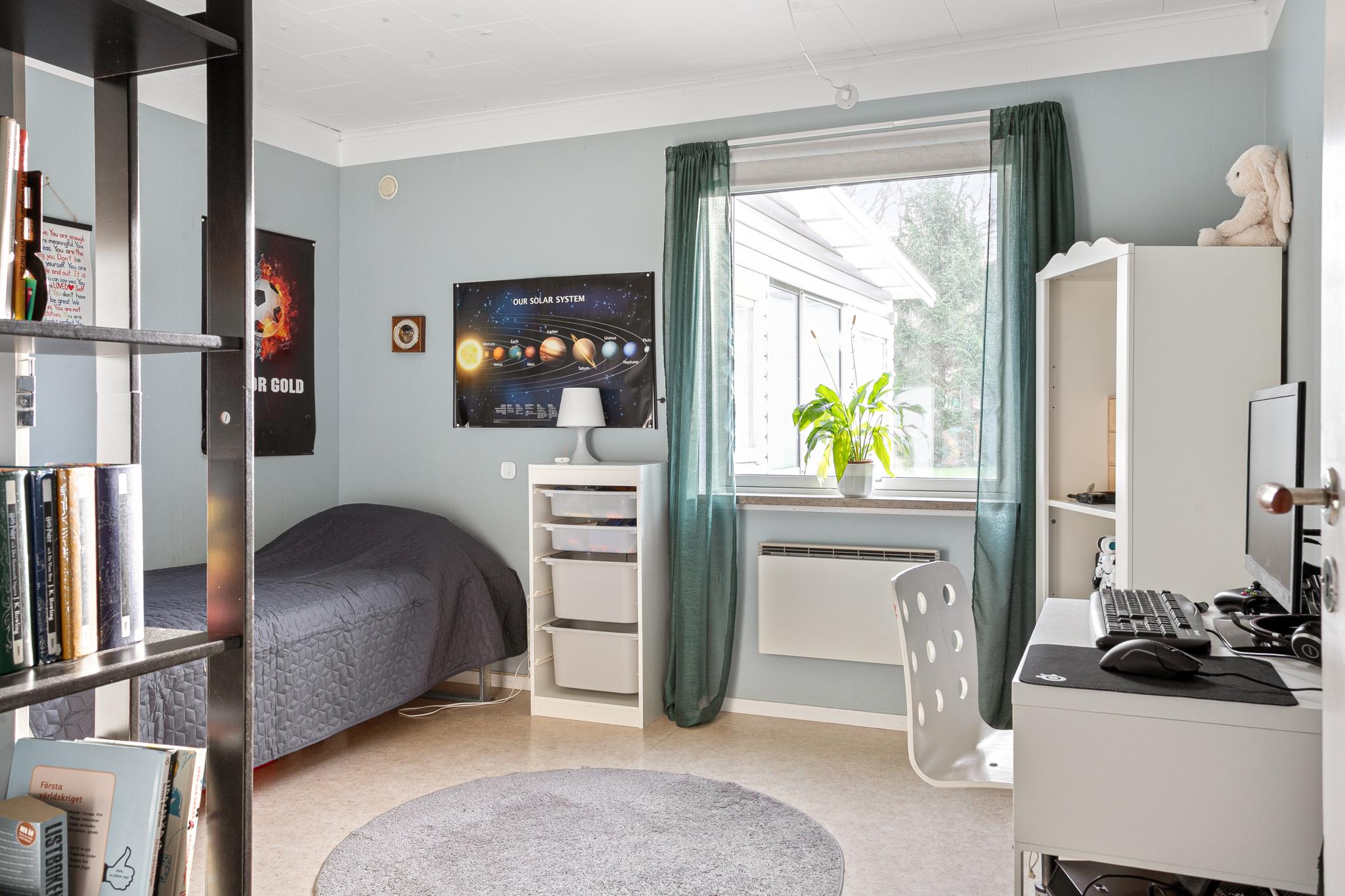 I fil med vardagsrummet ligger det andra sovrummet på entréplan. Rummet har bra förvaring och ett fönster mot tomten i öster.