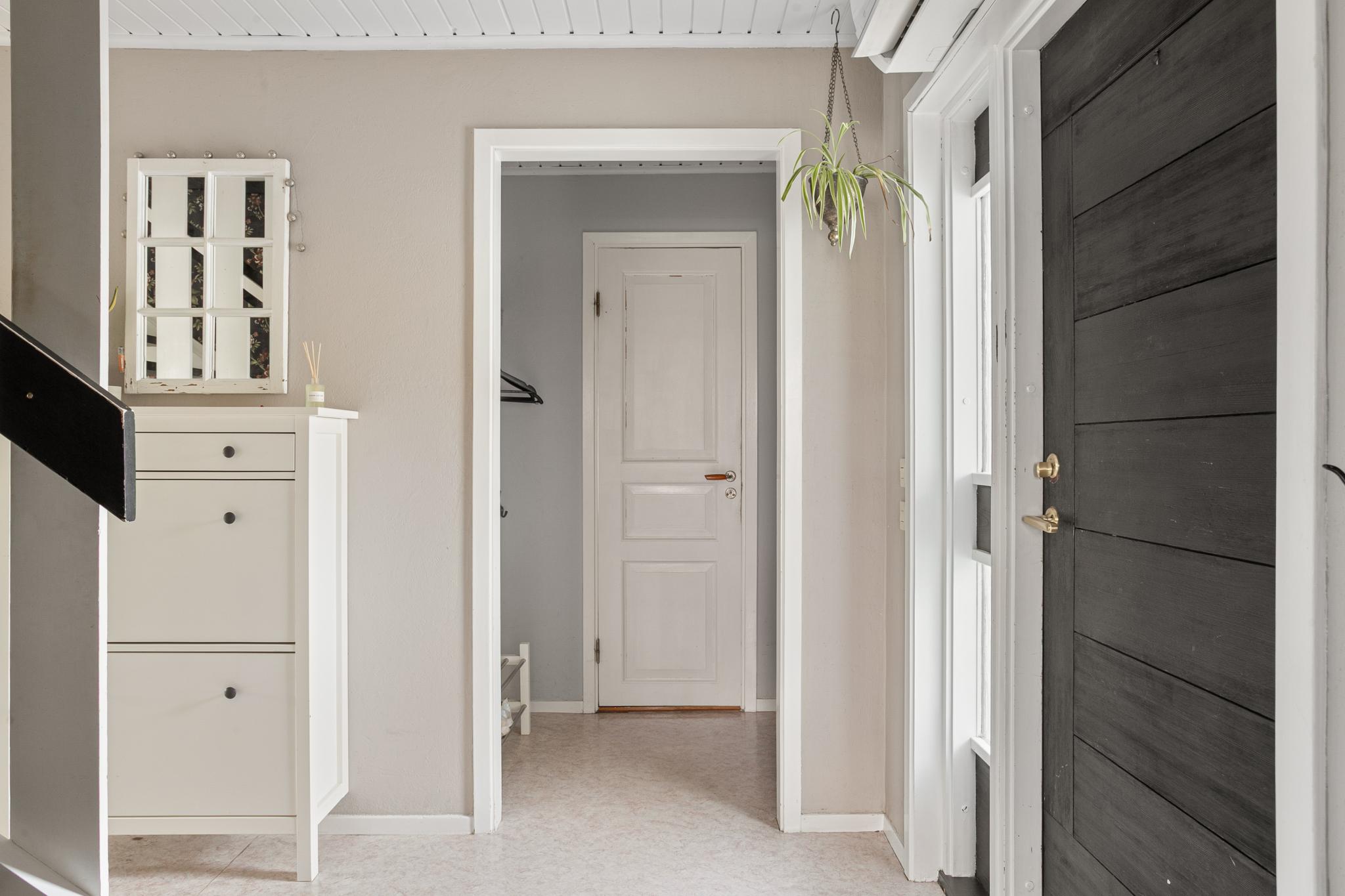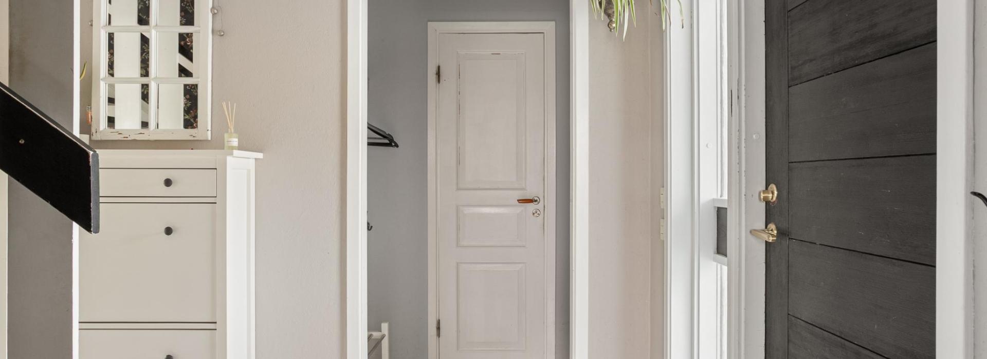 Hall med plats för ytterkläder och skor.