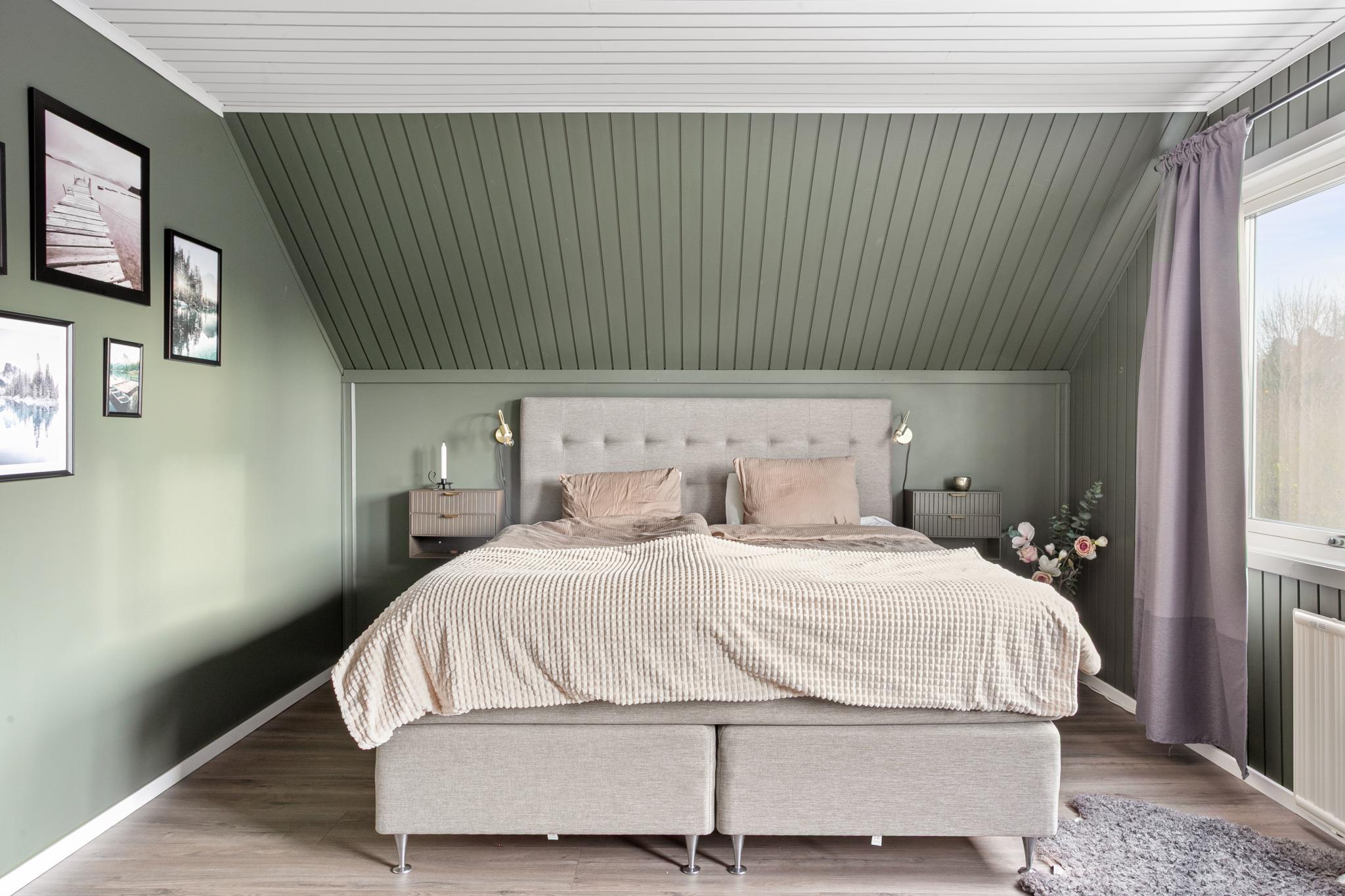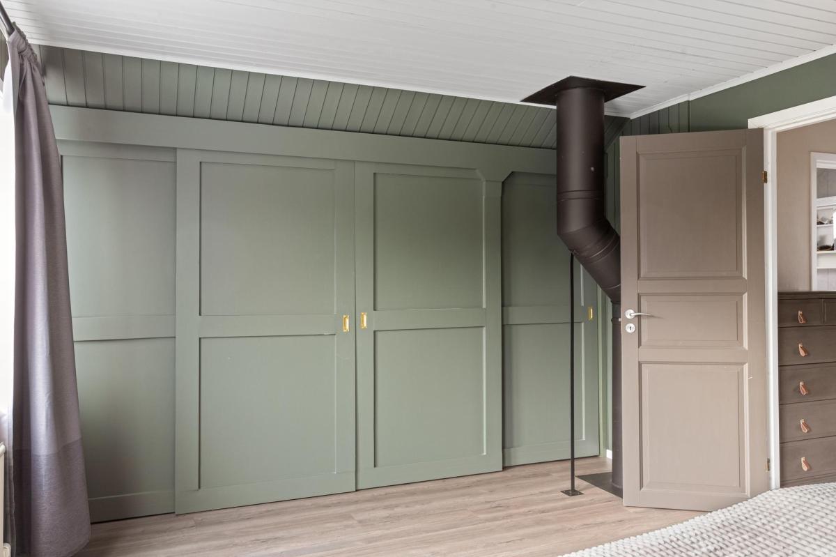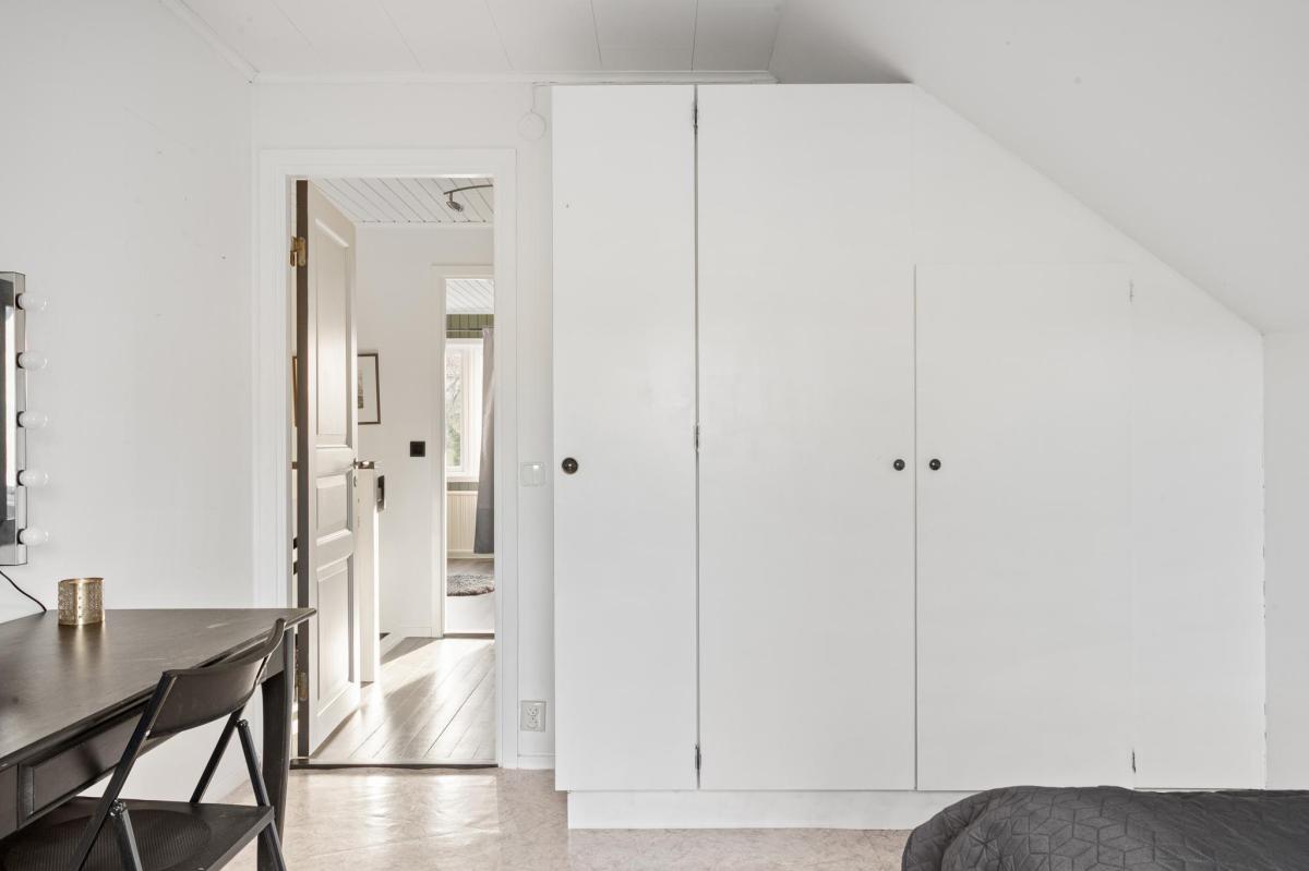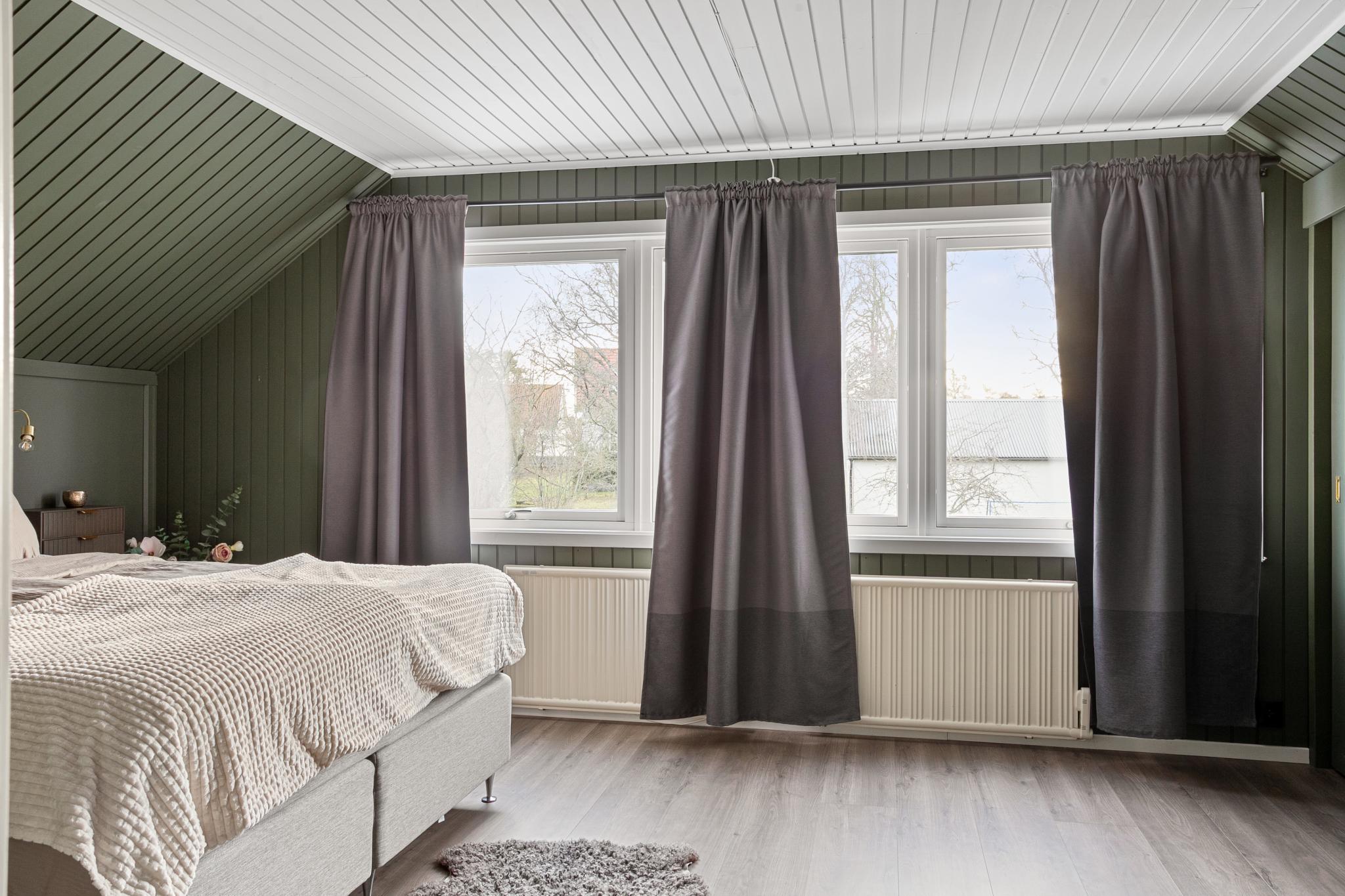 Direkt till vänster uppför trappan finns huset största sovrum. Rummet är smakfullt färgsatt, har bra förvaring bakom skjutdörrar och ett stort fönsterparti.