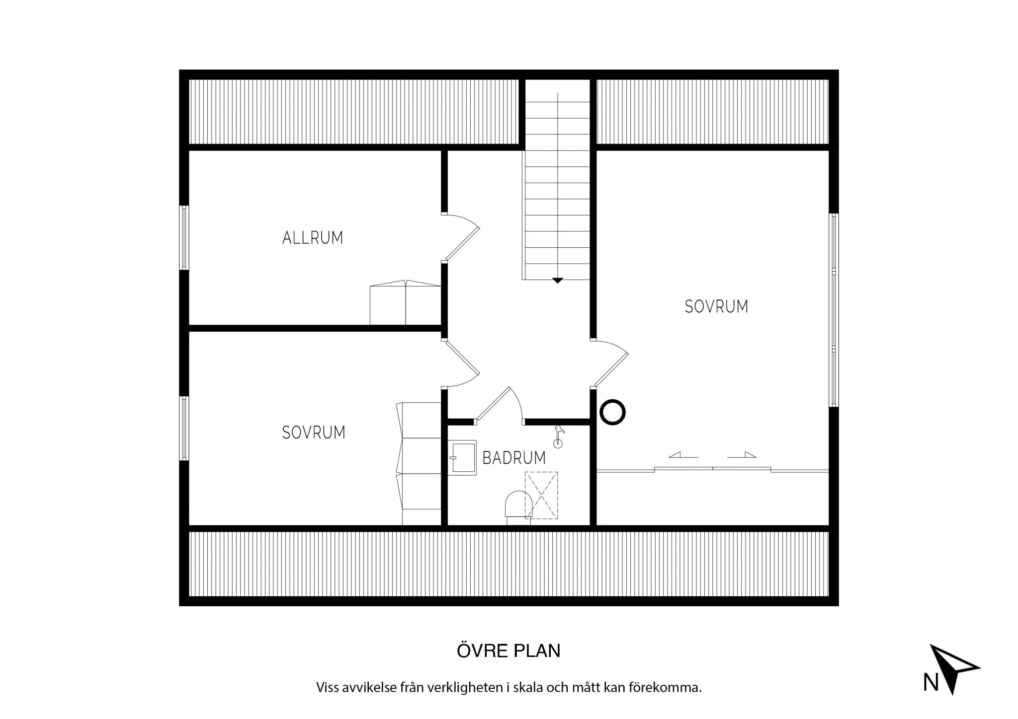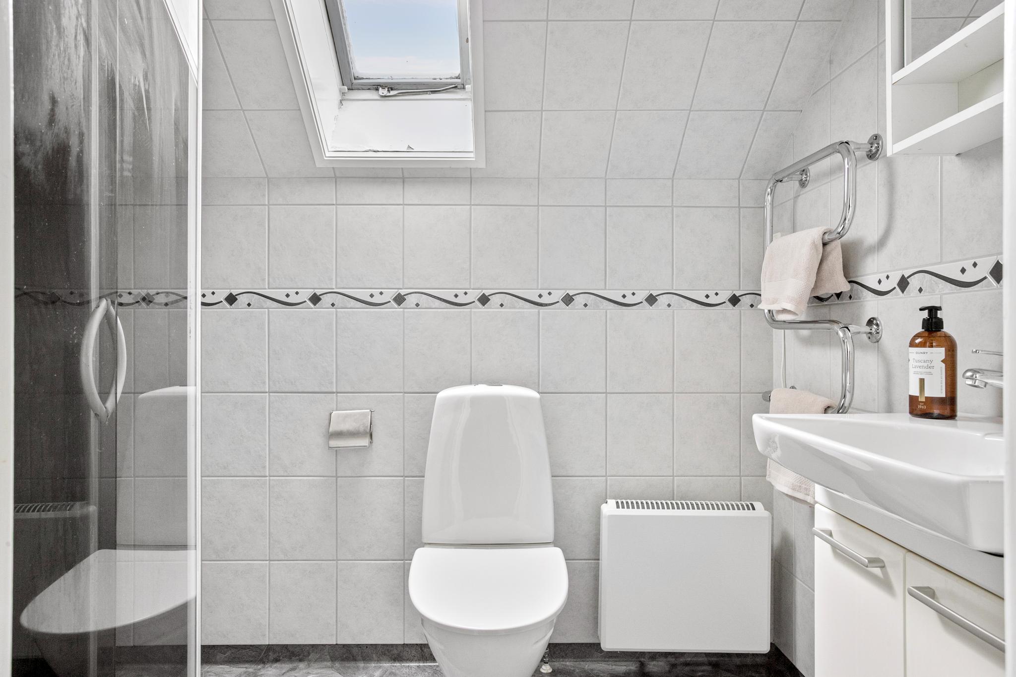 Även på övervåningen finns ett badrum med dusch, badrumsmöbel och wc.