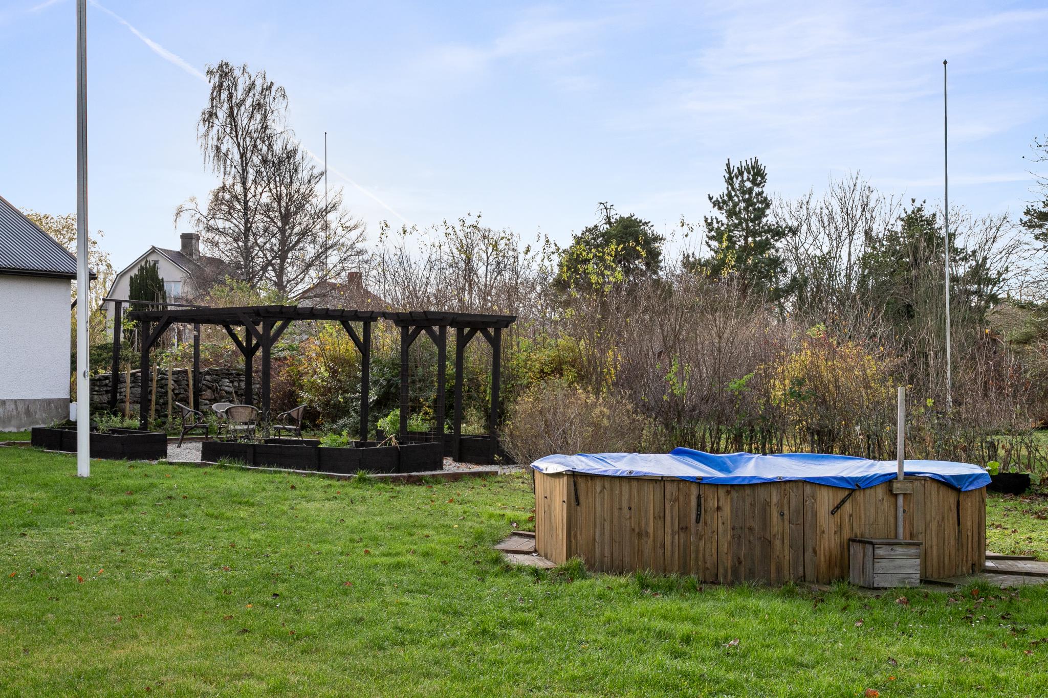 Fint uppvuxen och insynsskyddad tomt med flera sköna uteplatser. Härliga gräsytor, fruktträd och en nybyggd pergola (-24) med pallkragar för egna odlingar. På tomten finns dessutom en vedeldad badtunna och en ram för enklare sommarpool samt en trädkoja som lekplats för barnen.