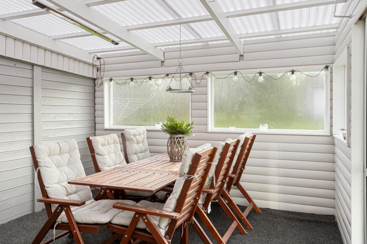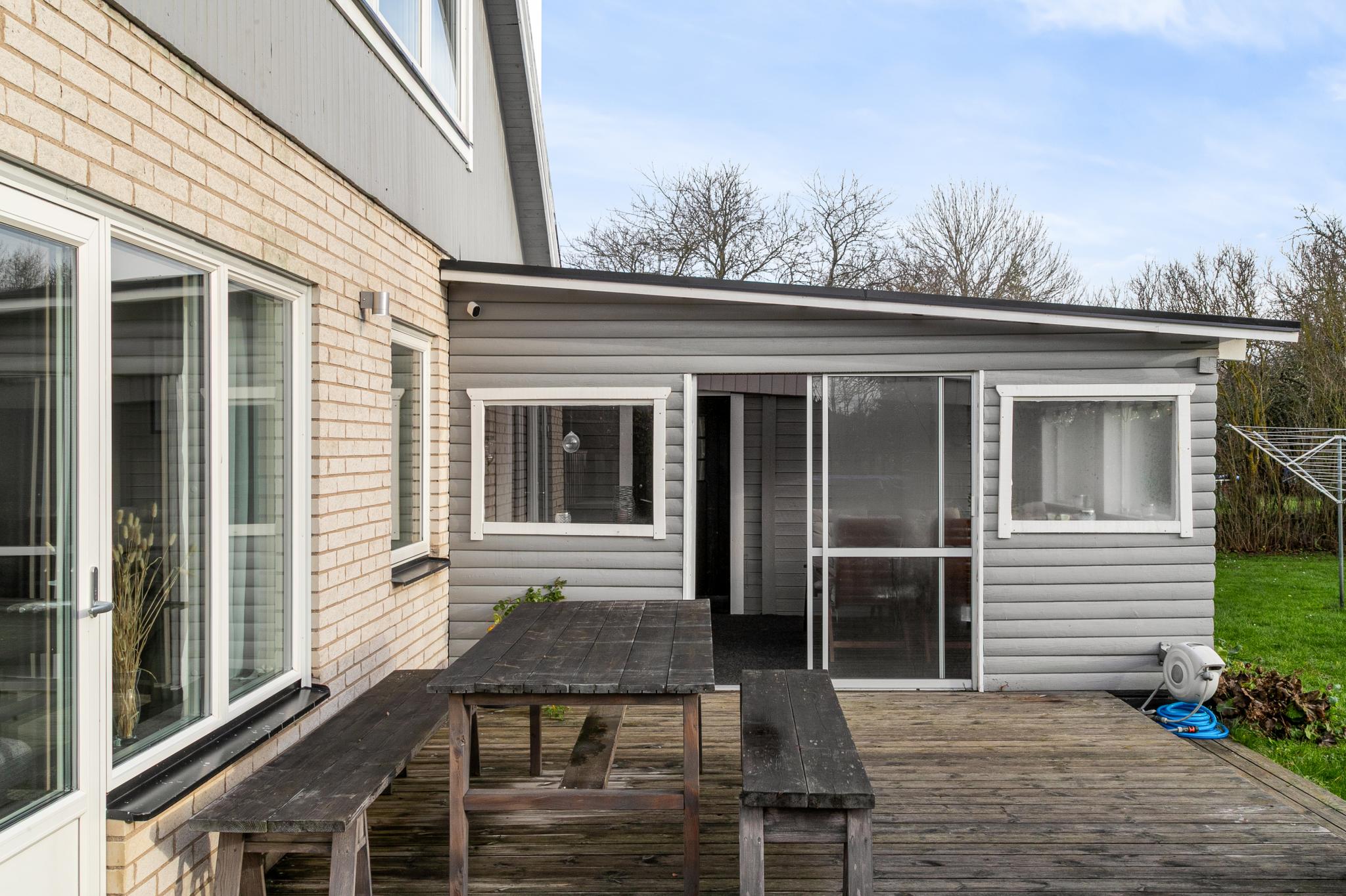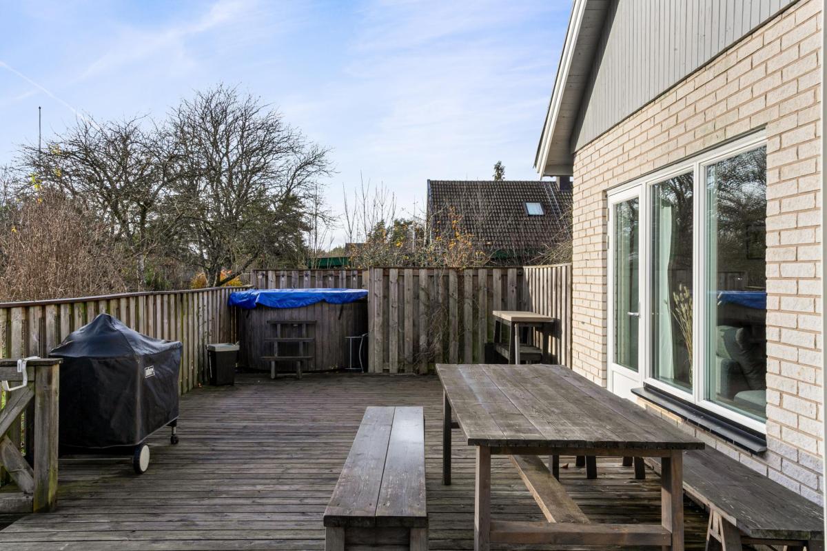 I skyddat läge intill huset på den sydöstra sidan ligger huset uteplats med både trädäck och inbyggt uterum.