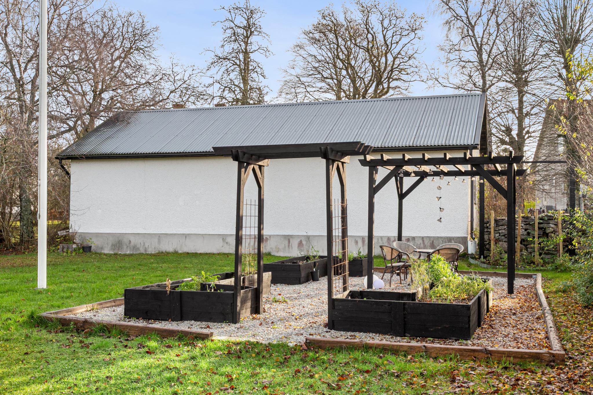 Intill huset finns ett trädäck i skyddat och solvänligt läge. I anslutning till trädäcket finns också ett inbyggt uterum. I skyddat läge finns även en nybyggd pergola (-24) med pallkragar för egna odlingar och behaglig plats för hammock och trädgårdsmöbel.