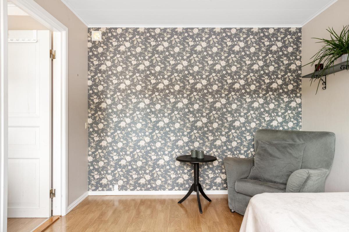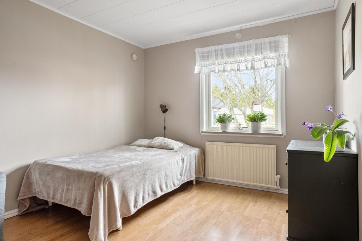 Innanför köket finns ett av två sovrum på entréplan. Liksom köket har rummet fönster mot Lillhagsgatan.