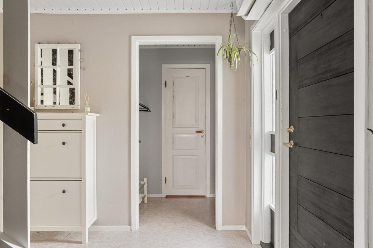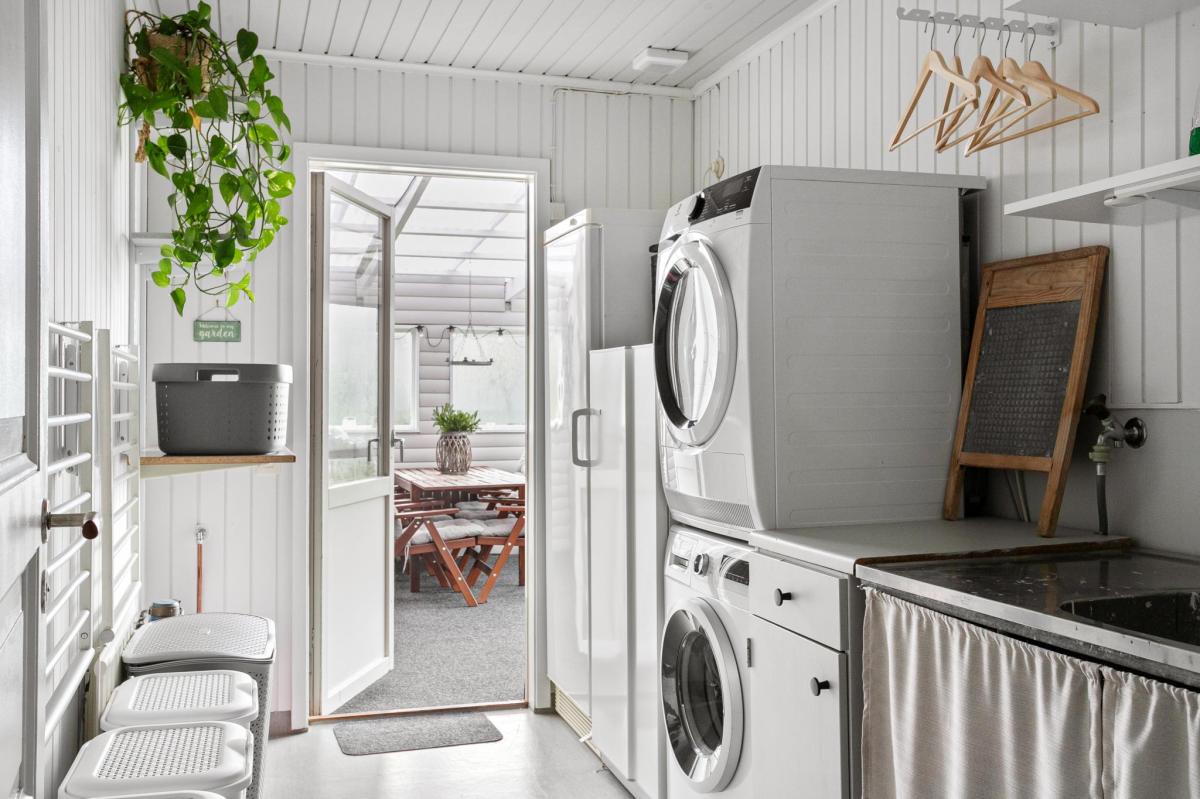 Ljus och fin tvättstuga med ytskikt från 2025. Tvättmaskin, torktumlare, husets varmvattenberedare och en frys i fullhöjd. Tvättho, hyllor och plats för tvättkorgar. Från tvättstugan kommer du också ut till det inbyggda uterummet och husets trädäck.