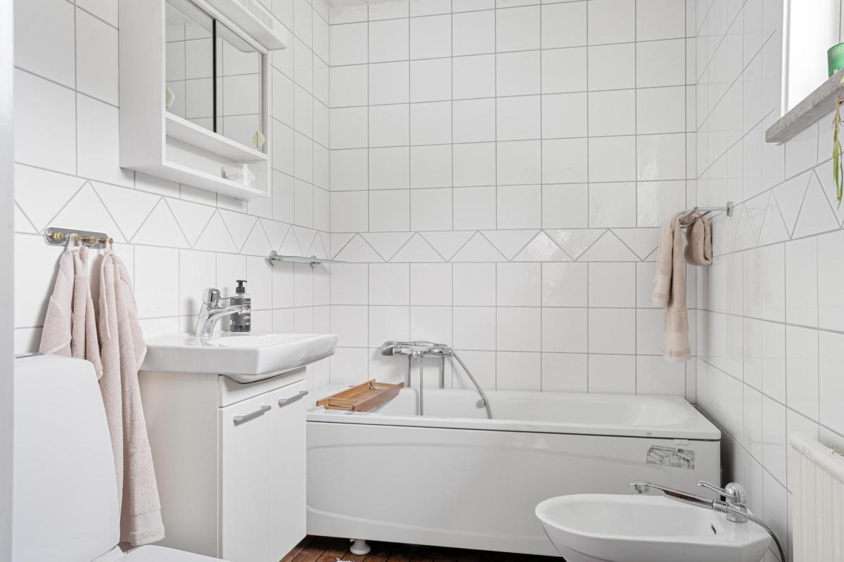 Helkaklat badrum med badkar, badrumsmöbel, bidé och wc.
