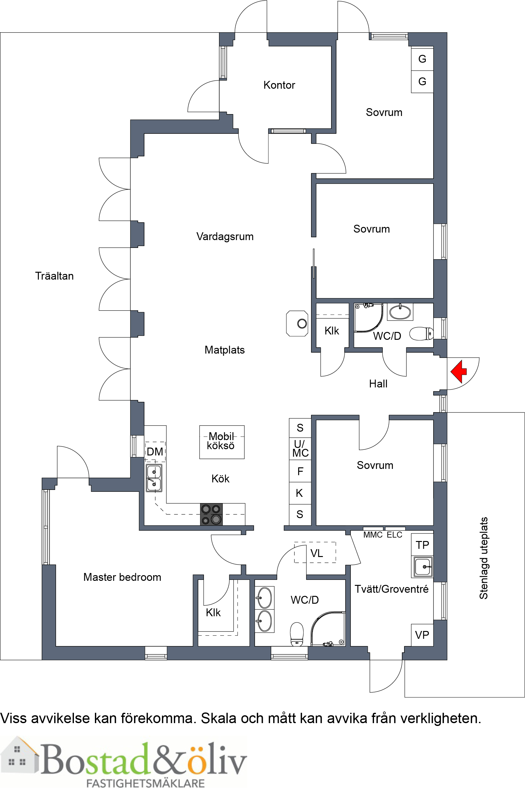 Utrustning: skåp, inbyggd microvågsugn, inbyggd ugn, frys, kyl, skåp, spishäll, spisfläkt och integrerad diskmaskin.
