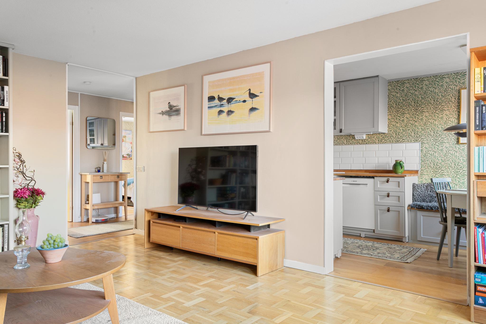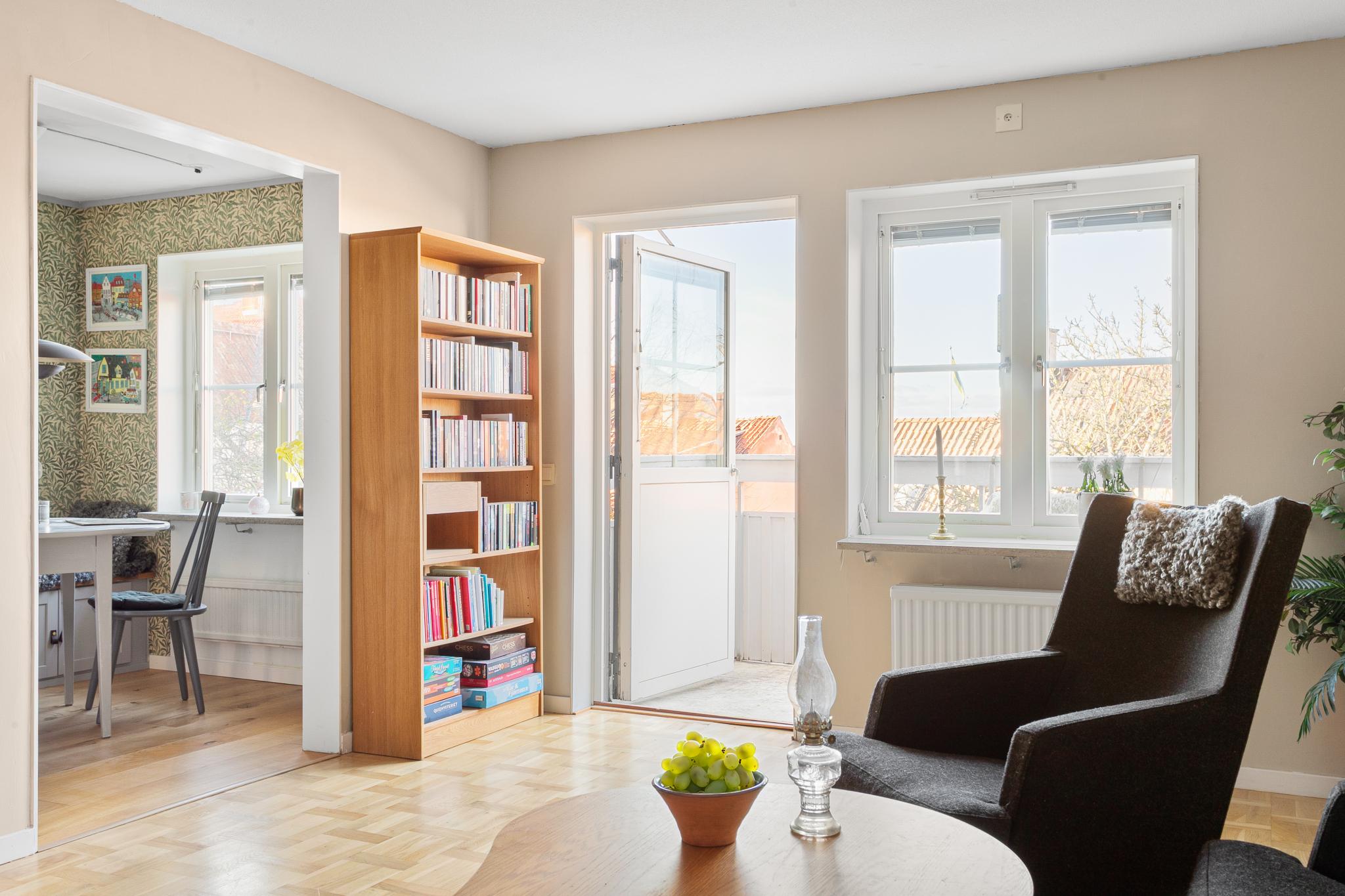 Rymligt vardagsrum med parkettgolv och öppning mot köket. Fönster och utgång till den egna balkongen.