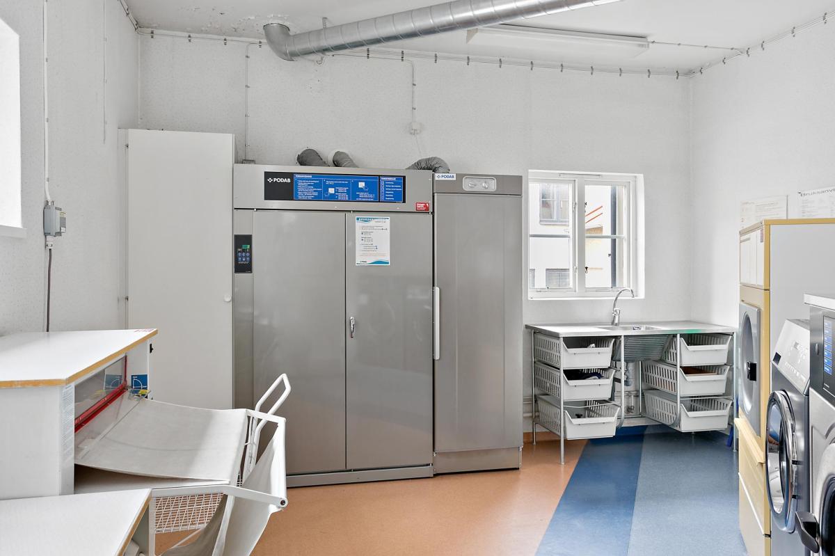 Tvättstuga med bra utrymme och bl a mangel och torkskåp
