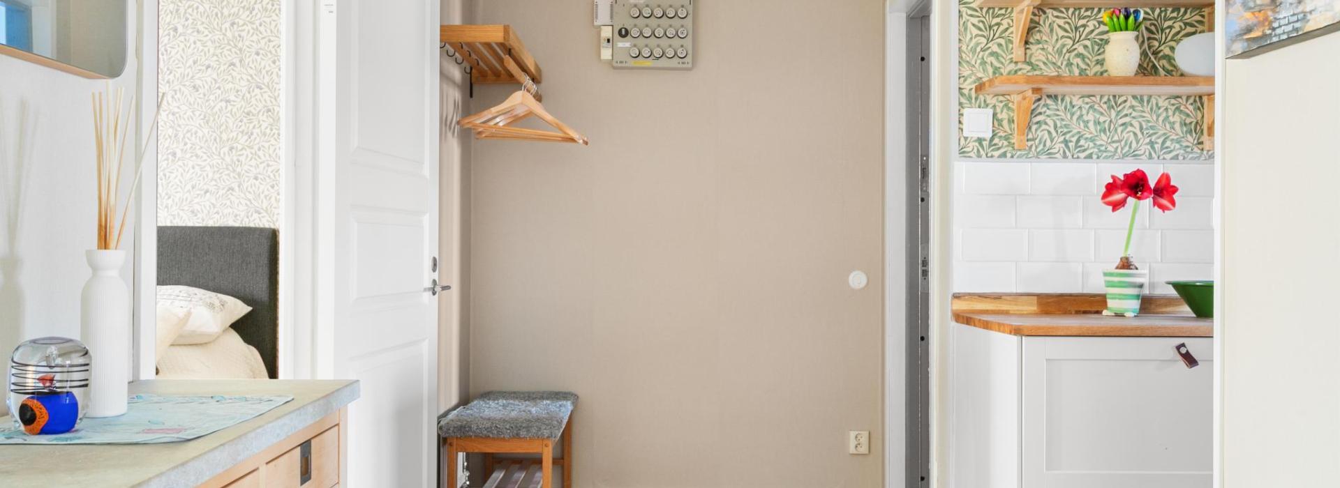 Till höger efter du hängt av dina ytterkläder ligger lägenhetens första sovrum. Rummet har trägolv, bra förvaring i fyra garderober och ett fönster mot föreningens gård i öst.